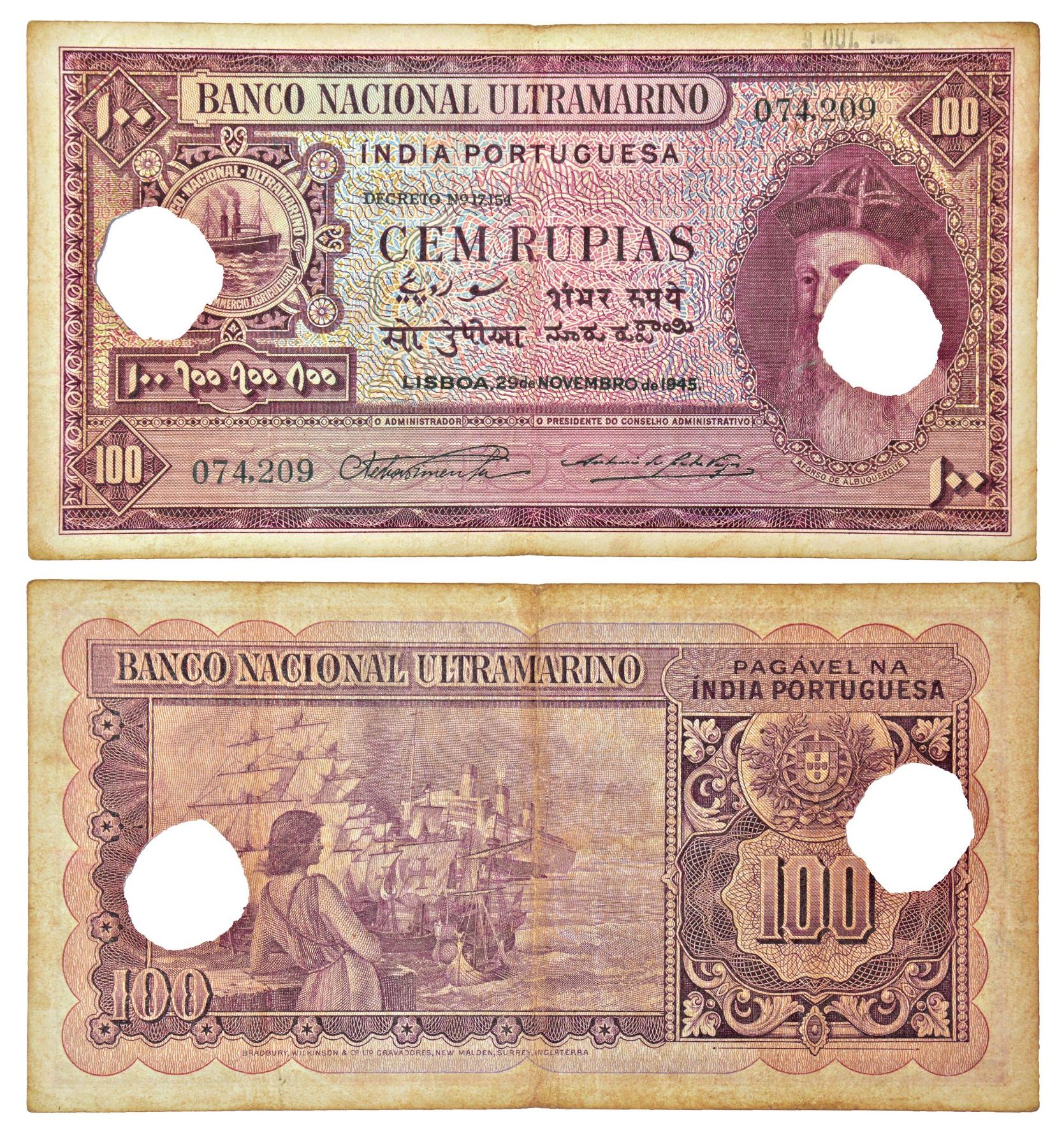 Indo-Portuguese Territories, 100 rupias, 6th issue, 29th November 1945, signed by Antonio Dos Santos Viegas as President of Administrative Council and Antonio Pedroso Pimenta as Administrator, serial no.: 074,209, Decreto No.: 17.154 in black, printed by Bradbury Wilkinson & Co., J&R 12.33.7.