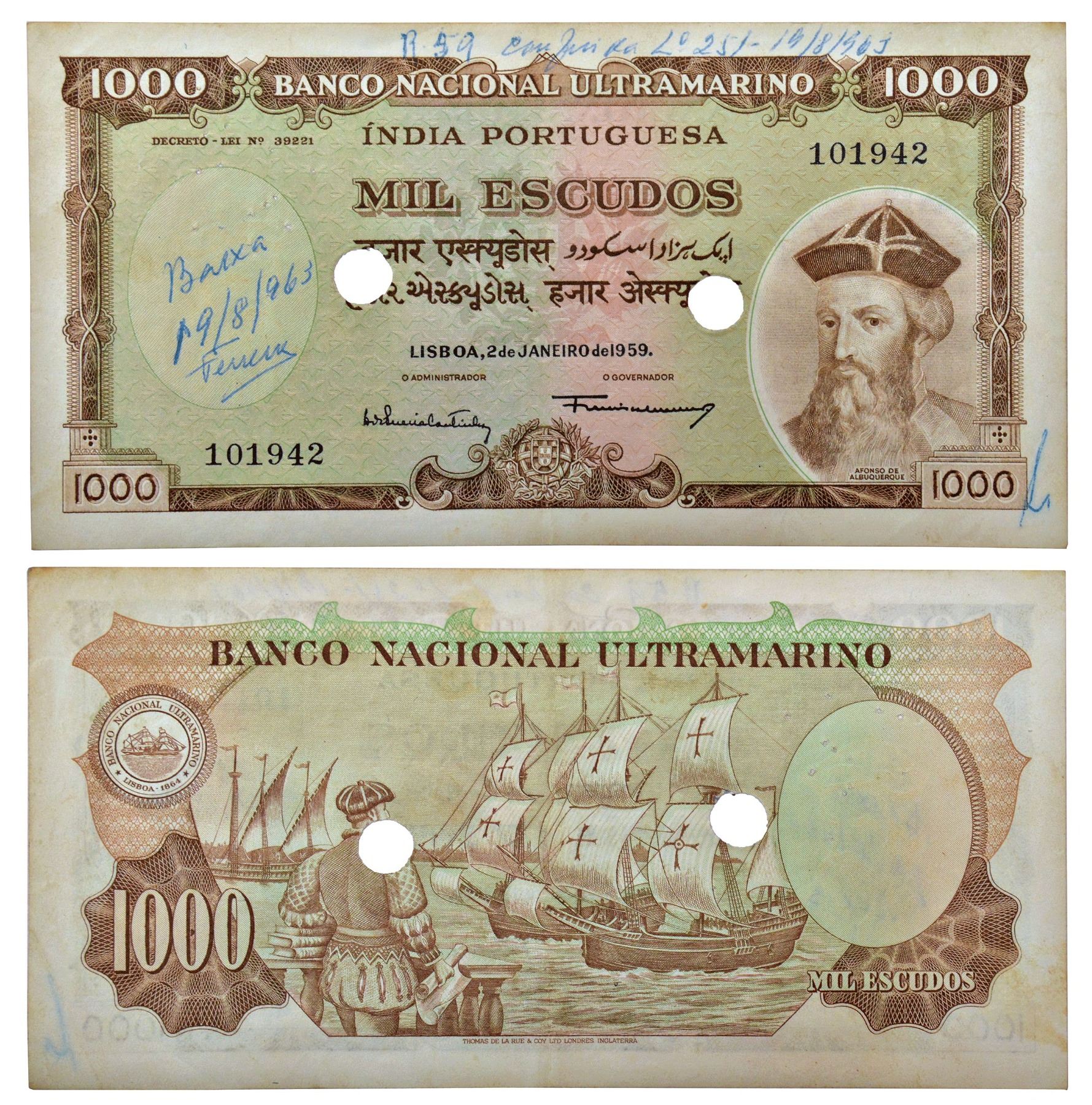 Paper Money: Indo-Portuguese Territories, 1000 Escudos, 7th Issue, dated 2nd January 1959, signed by Francisco Jose Vieira Machado as Governor and Luis Pereira Coutinho as Administrator, serial no.: 101942, Decreto-Lei No.: 39221 on top left, Printed by Thomas de la Rue, London, J&R 12.40.3.