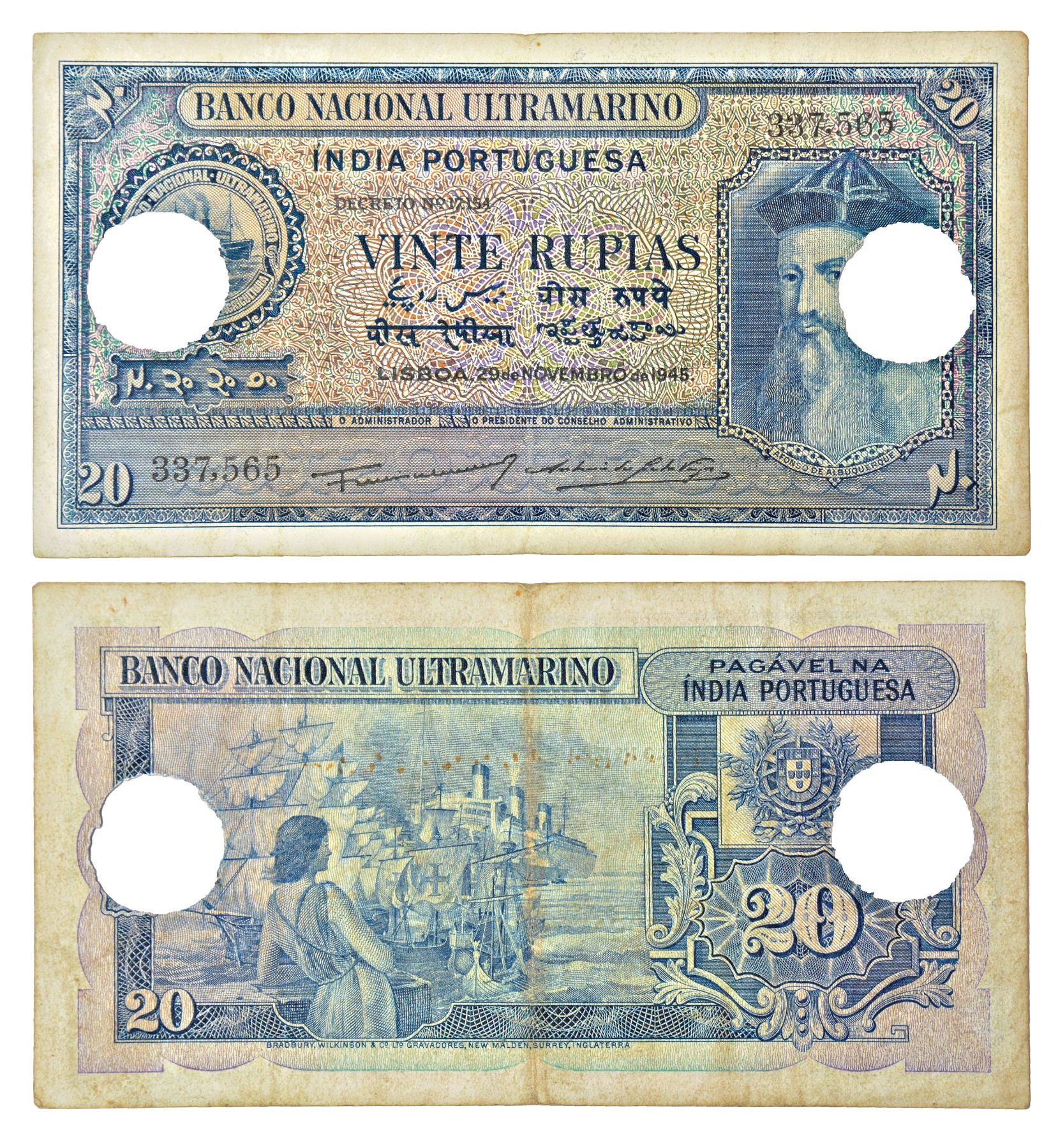 Paper Money: Indo-Portuguese Territories, 20 rupias, 6th issue, 29th November 1945, signed by Antonio Dos Santos Viegas as President of Administrative Council and Francisco Jose Vieira Machado as Administrator, serial no.: 337,565, Decreto No.: 17.154 in black, Printed by Bradbury Wilkinson & Co., J&R 12.31.6.