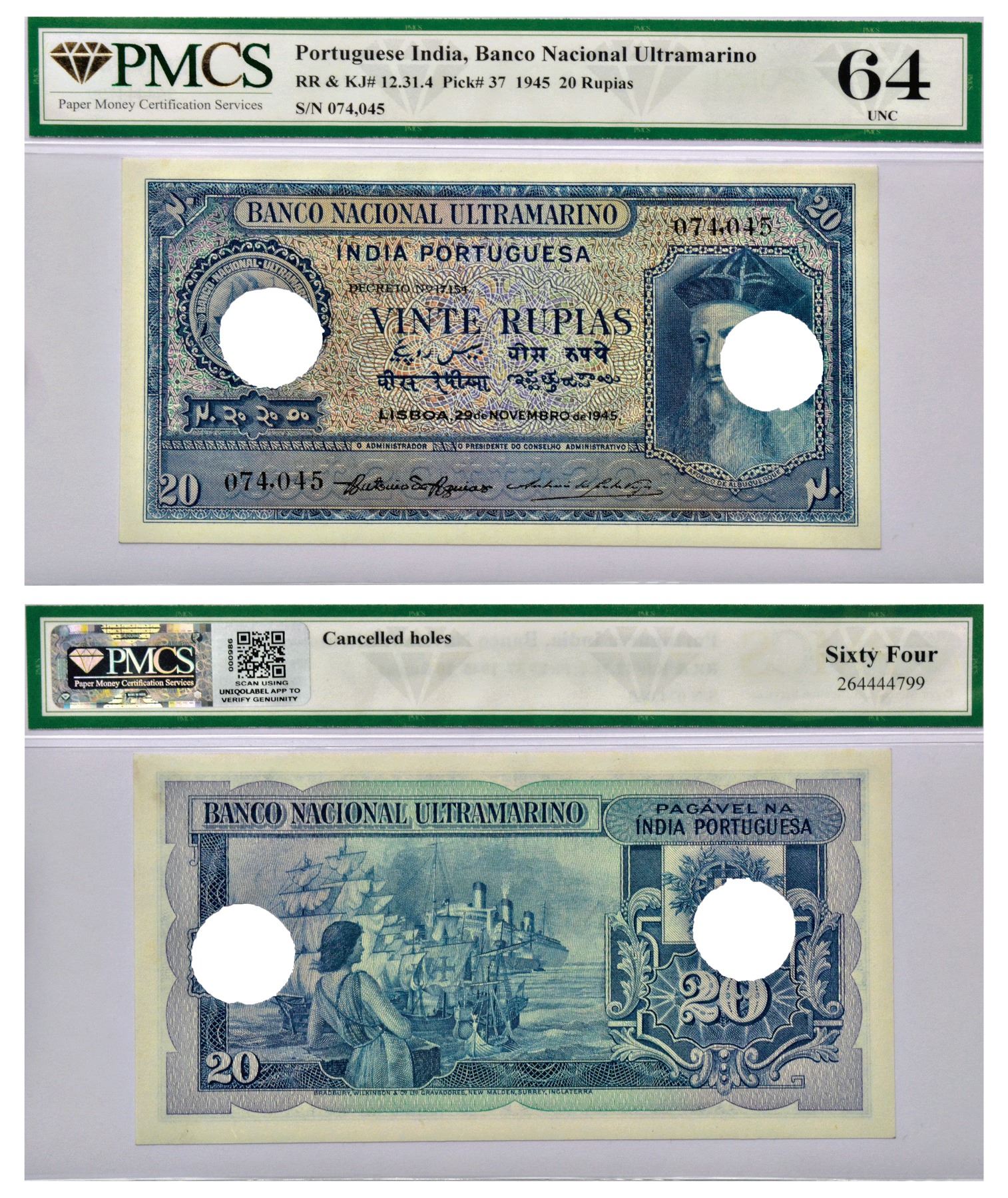 Indo-Portuguese Territories, 20 rupias, 6th issue, 29th November 1945, signed by Antonio Dos Santos Viegas as President of Administrative Council and Antonio Augusto Correia de Aguiar as Administrator, Serial No.: 074,045, Decreto No.: 17.154 in black, printed by Bradbury Wilkinson & Co., J&R 12.31.4.