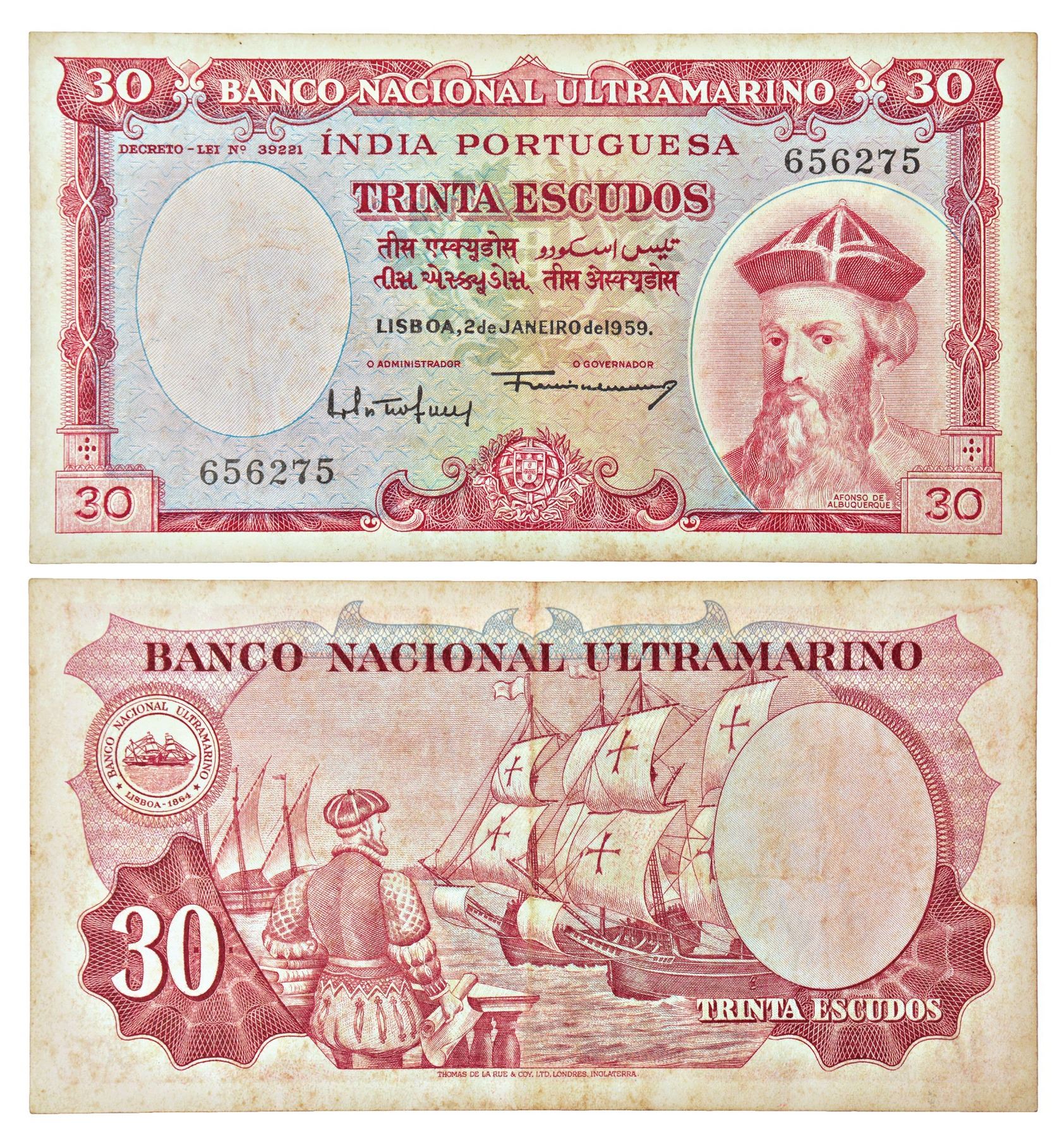 Indo-Portuguese Territories, 30 escudos, 7th issue, dated 2nd January 1959, signed by Francisco Jose Vieira Machado as Governor and Antonio Julio de Castro Fernandes as Administrator, serial no.: 656275, Decreto-Lei No.: 39221 on top left, printed by Thomas de la Rue, London, J&R 12.35.4.