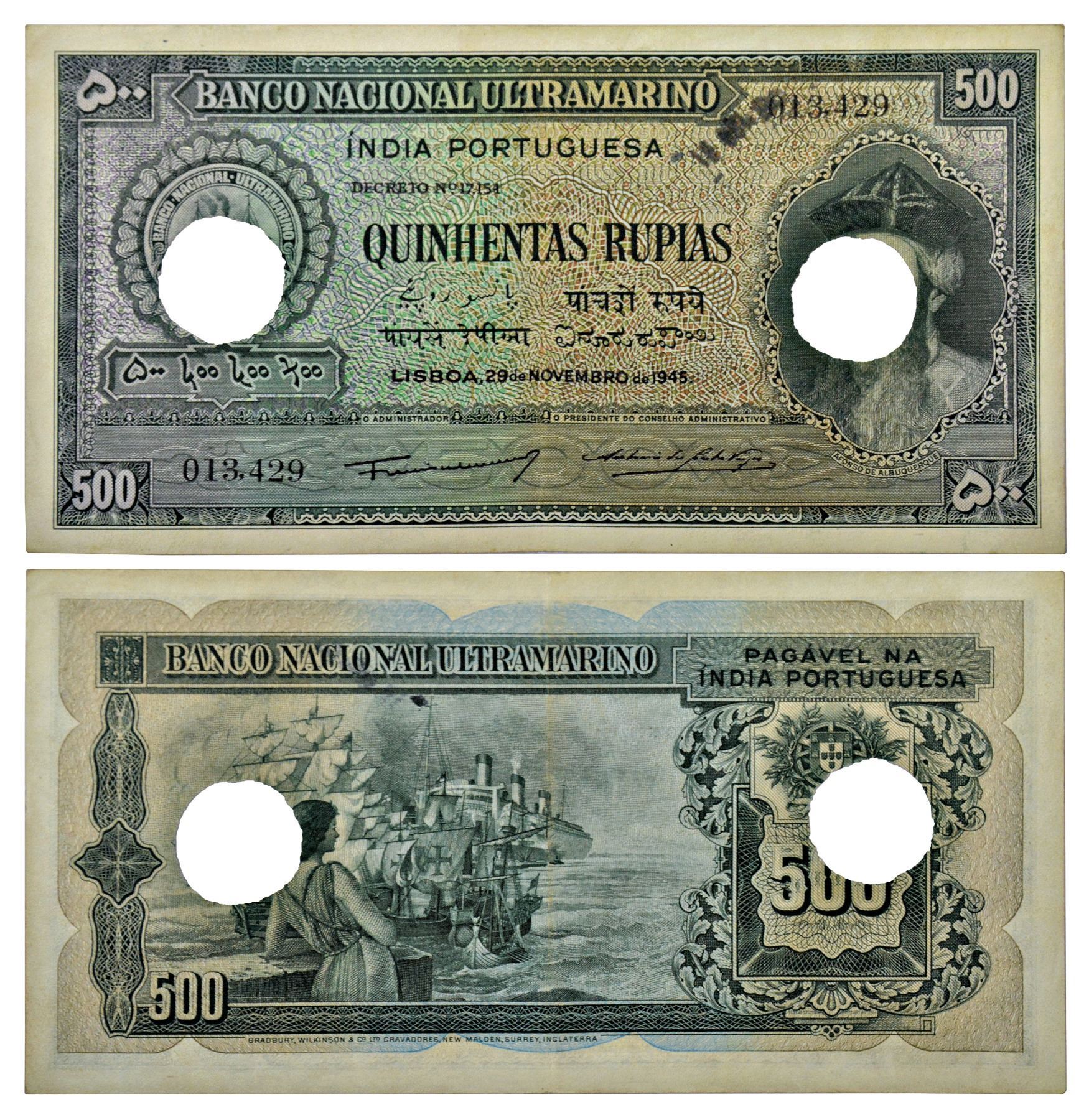 Indo-Portuguese Territories, 500 rupias, 6th issue, dated 29th November 1945, signed by Antonio Dos Santos Viegas as President of Administrative Council and Francisco Jose Vieira Machado as Administrator, serial no.: 013429, decreto no.: 17.154, printed by Bradbury Wilkinson & Co., cancelled hole, J&R 12.34.6.