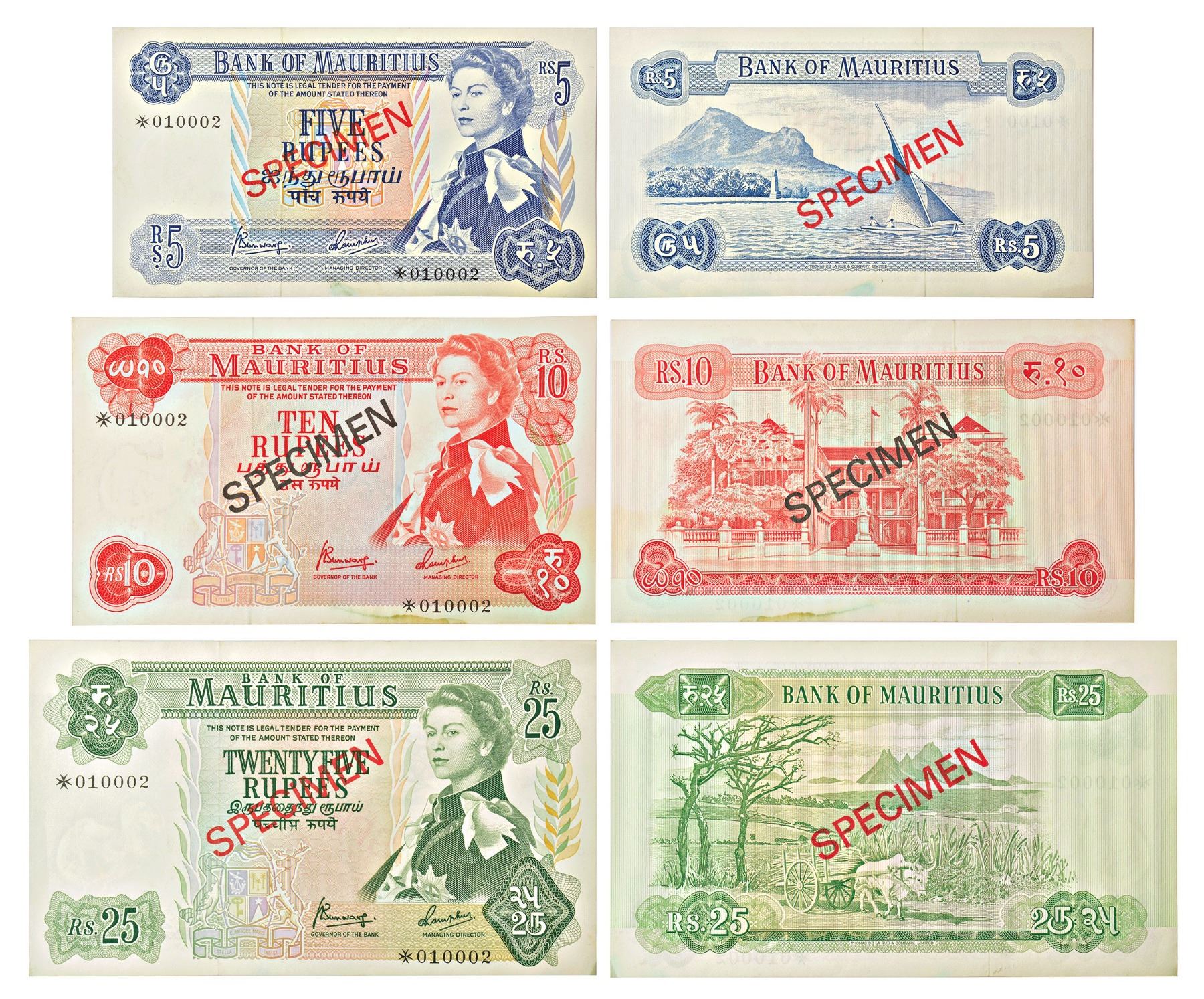 Mauritius, Queen Elizabeth II, set of 3 SPECIMEN notes, 5 rupees, 10 rupees and 25 rupees, serial no.: * 010002 in all notes. (3 notes)