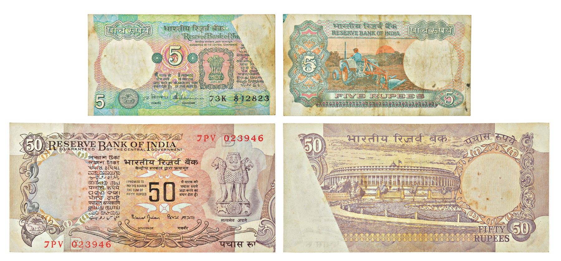 Paper Money: Misprint notes (2), 1x 5 rupees, signed by S. Venkitaraman, serial no.: 73K 812823 and 1x 50 rupees, signed by Bimal Jalan, serial no.: 7PV 023946, flip error on both notes. (2 notes)