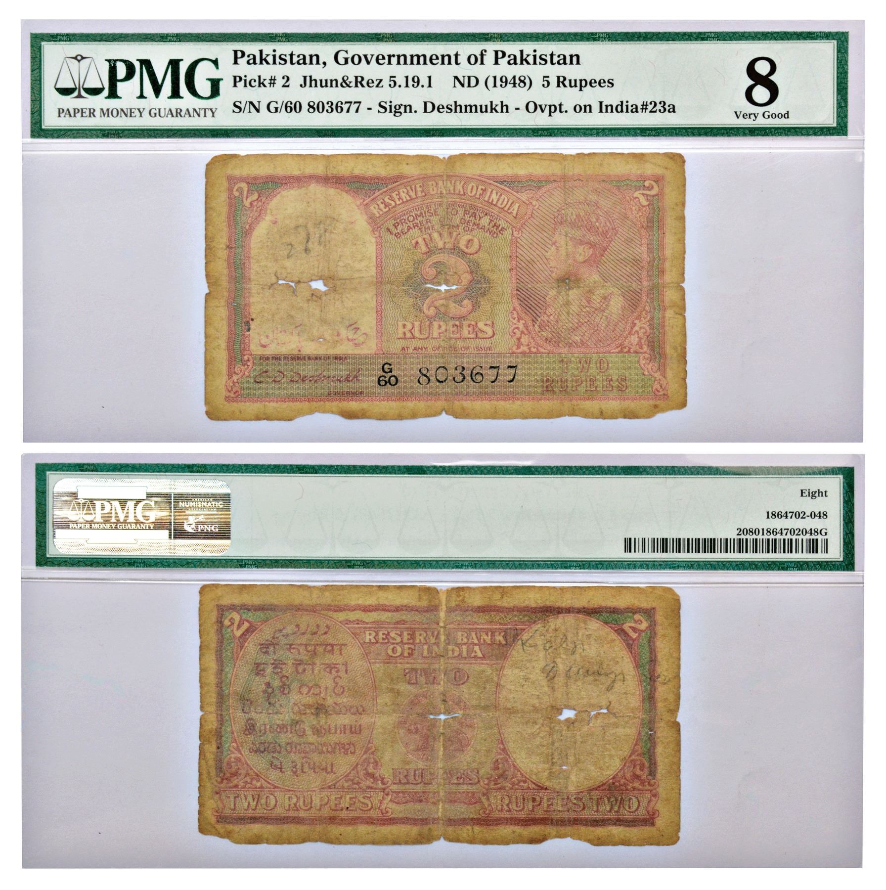 Pakistan, George VI, 2 rupees, ND (1948), signed by C.D. Deshmukh, serial no.: G27 843686, in black, Government of Pakistan in English and Hukumat-e-Pakistan in Urdu overprinted indistinct on Watermark panel, J&R 5.18.1, wrongly written J&R 5.19.1. by PMG.