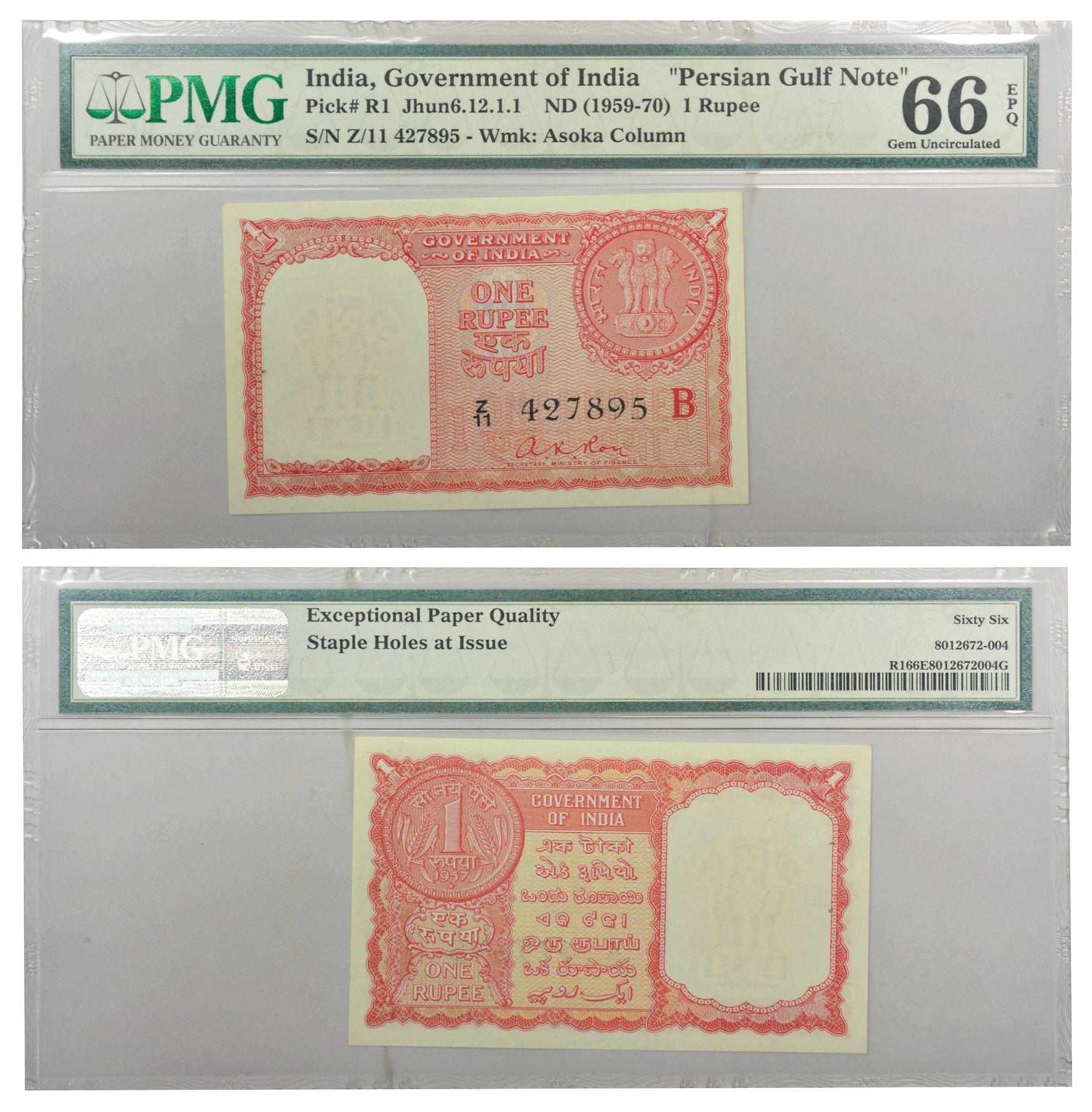 Persian Gulf Issue, 1 rupee, 1957, signed by A.K. Roy, inset 'B', serial no.: Z11 427895, J&R 6.12.1.1.