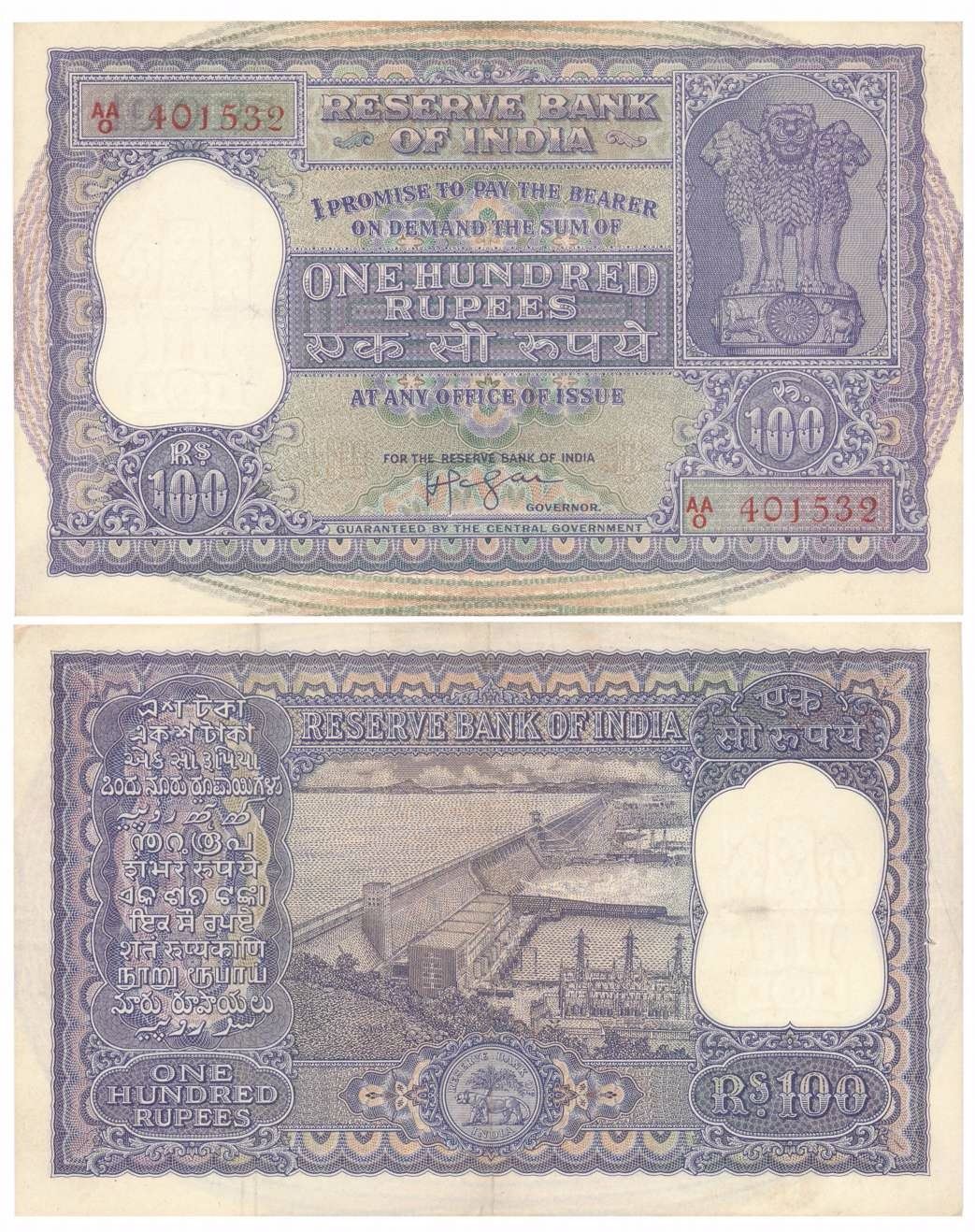 Rupees 100, Type 7.4, Signed H. V. R. Iengar, Prefix AA/0 (Jhun# 7.4.1). Usual pin hole, very fine+.
