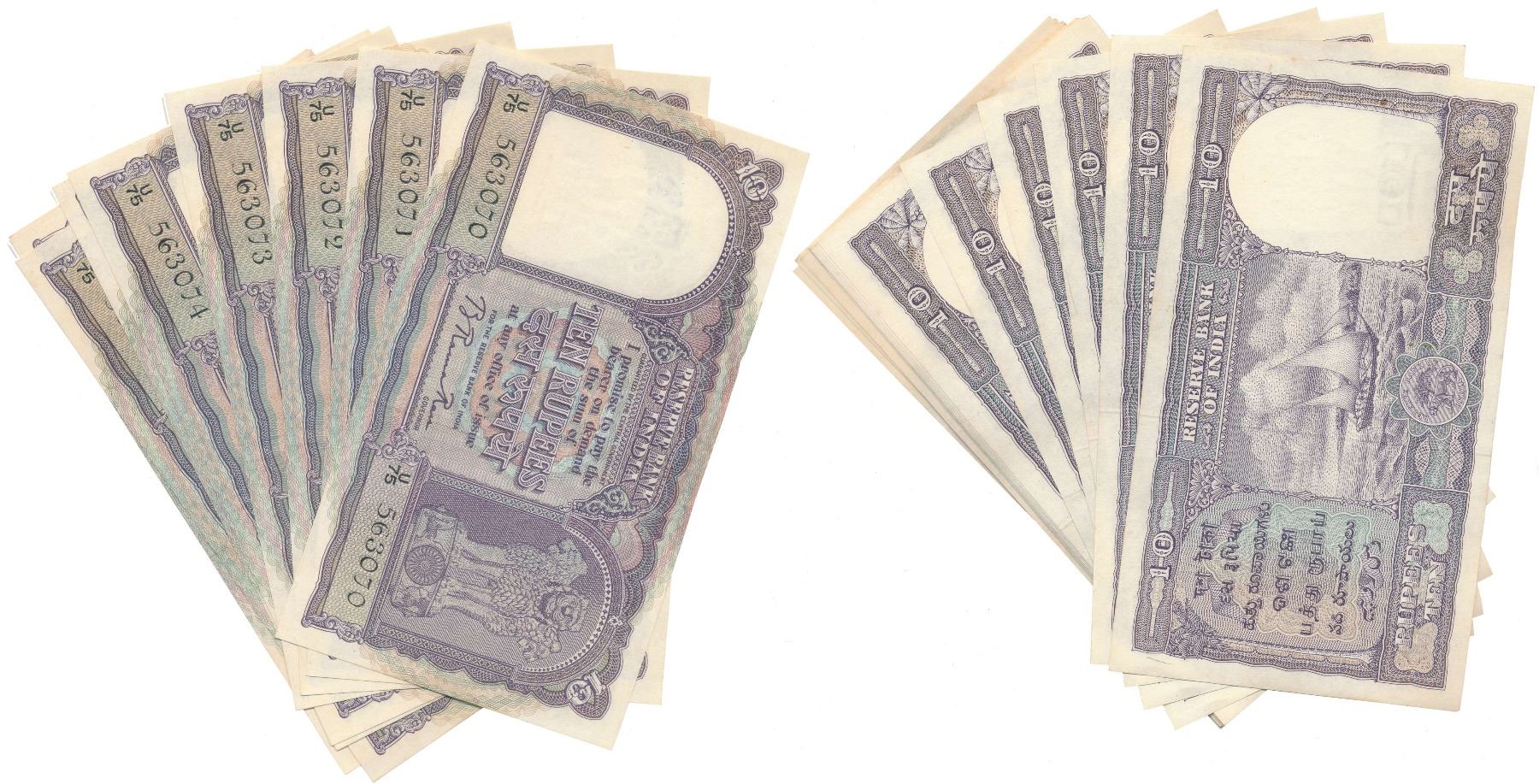 Rupees 10, consecutive 21 Notes, Type 4.3, Signed B Rama Rau, Prefix U/75 (Jhun# 4.3.1). Usual pin hole, about uncirculated. 21 Notes.