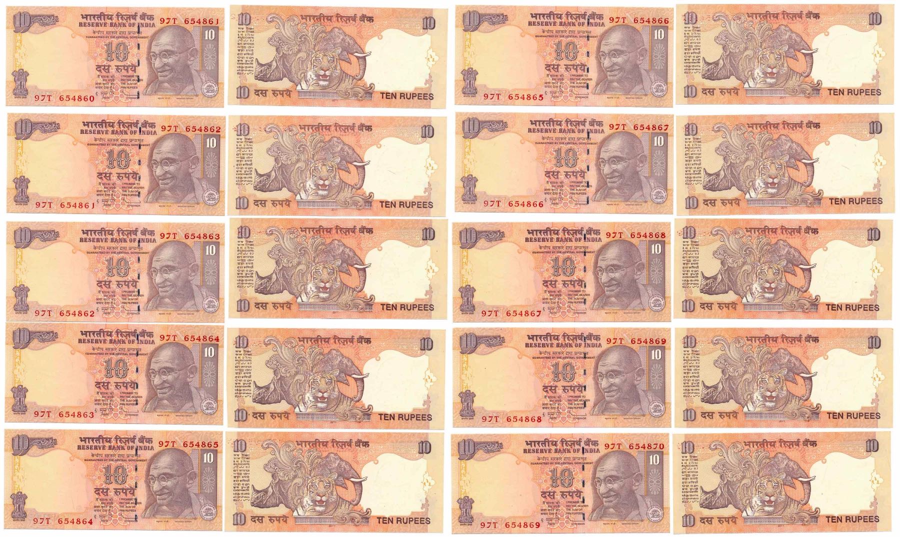 Rupees 10 (10), Error- Mis Match Numbers, 2011, Sign D Subbarao, Prefix 97T. About uncirculated, consecutive Mis Match Numbers of 10 Notes.