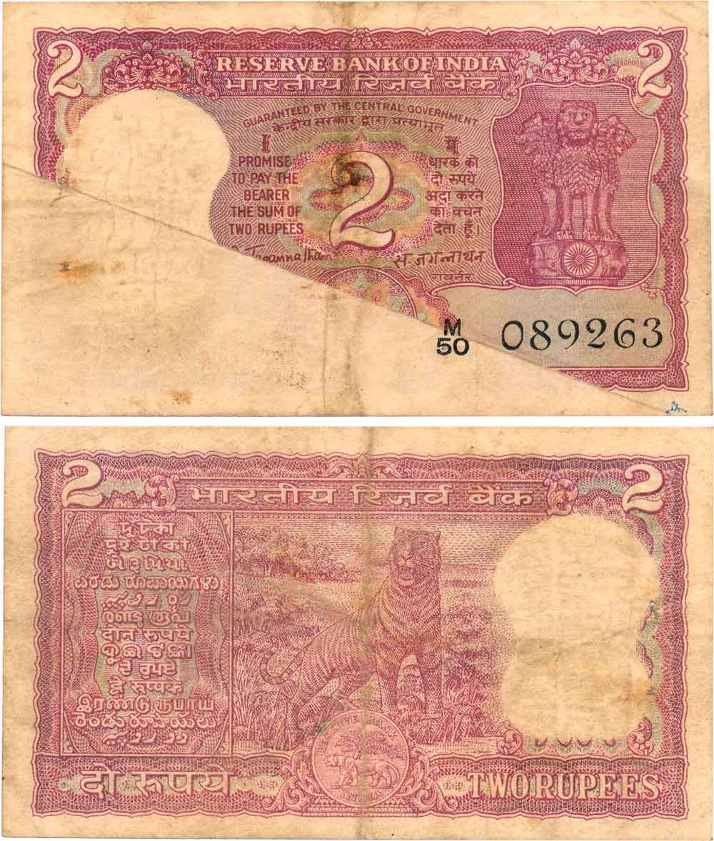 Rupees 2, Error, "Partially blank on obverse", Type 2.8, Signed S Jagannathan, Prefix M50 (Jhun# 2.8.1A). Very fine, rare.