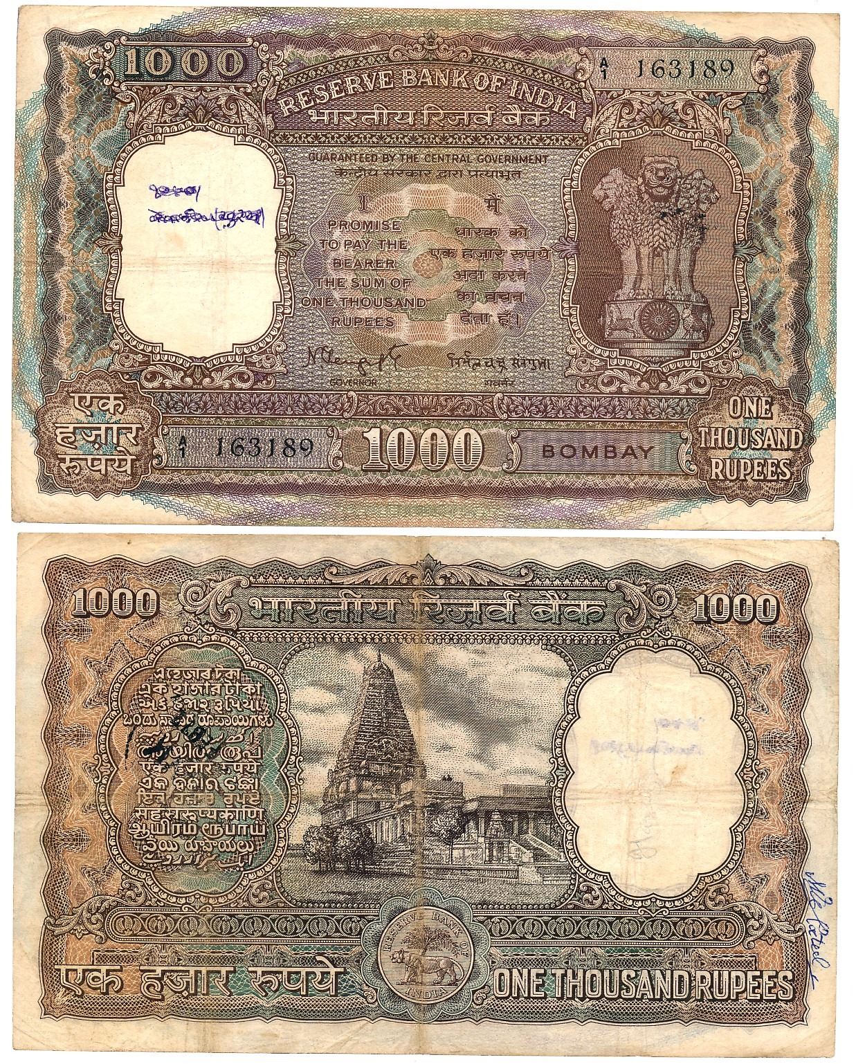 Rupees 1000, Type 6.9.4, Signed N. C. Sengupta, Prefix A/1, Bombay (R IPM# 6.9.4.1). Graffiti on reverse, written in watermark panel, center fold. Very fine for type.