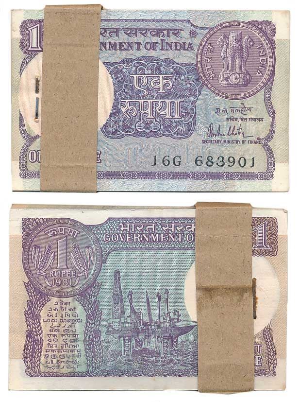 Rupee 1, Pack of 100 Notes, “A-43”, 1981, Type 6.1.9, Signed by R. N. Malhotra, Prefix 16/G (R IPM # 6.1.9.1). Uncirculated. 100 Notes.