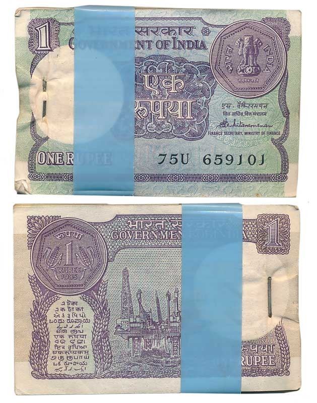 Rupee 1, Pack of 100 Notes, “A-48”, 1985, Type 6.1.10, Signed by S. Venkitaraman, Prefix 75/U (R IPM # 6.1.10.2A). Uncirculated. 100 Notes.