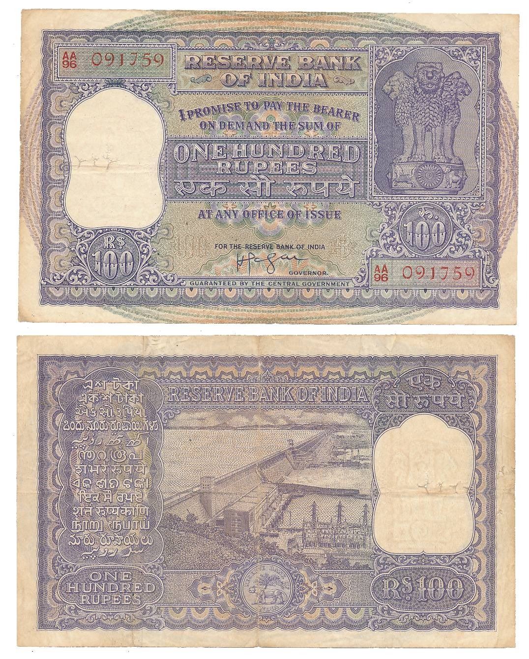 Rupees 100, Type 6.7.4, Signed by H V R Ienger, Prefix AA/96, Serial number in Red (RIPM# 6.7.4.1). Very fine.