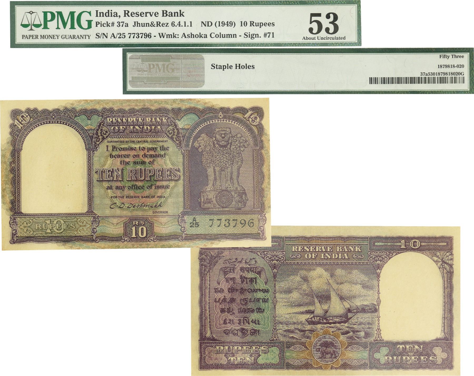 Rupees 10, 1949, signed C. D. Deshmukh, (J&R 6.4.1.1). PMG Graded 53, About Uncirculated, Very Rare.