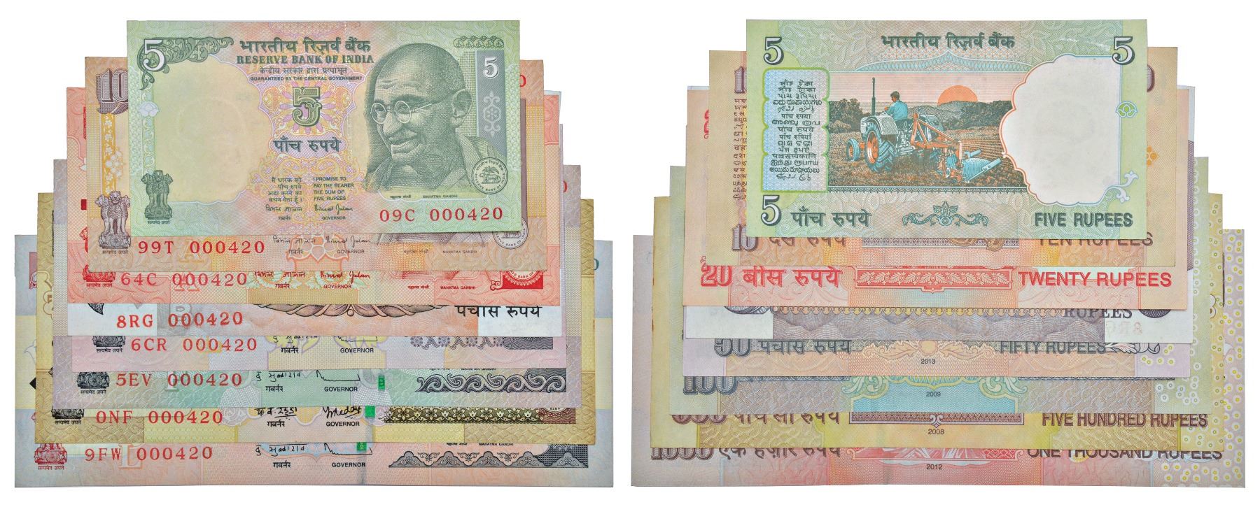 Semi fancy number set of 8 notes, 5 rupees to 1000 rupees (50 rupees - 2 notes), various governors' signature, various inset, all serial no.: 000420.(8 notes)