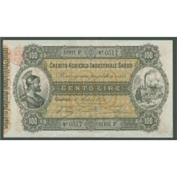 Paper Money of XIX Century after Italian Unification - Credito Agricolo Industriale Sardo - 100 L. 12/03/1874 - 1874 - Timbro a secco in alto con croce Savoia ed i quattro Mori - Qualità straordinaria