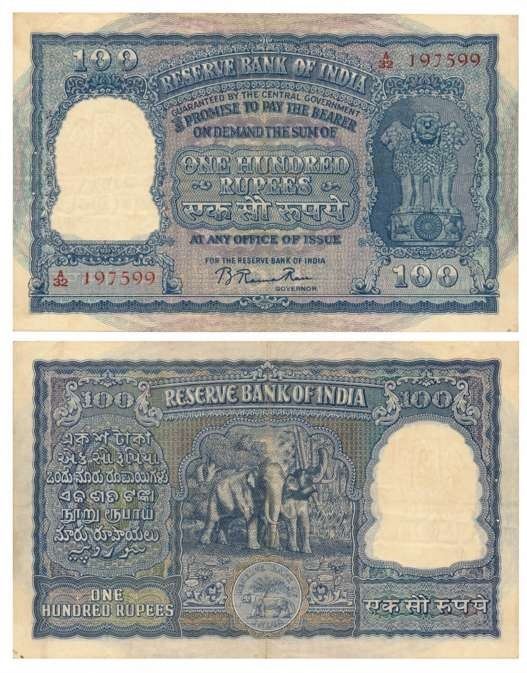 Rupees 100, 3rd issue, Type 7.3, Signed B Rama Rau, Prefix A/32, Serial Number in Red, Bombay issue (Jhun# 7.3.1). Light fold, Usual Pin hole, very fine.