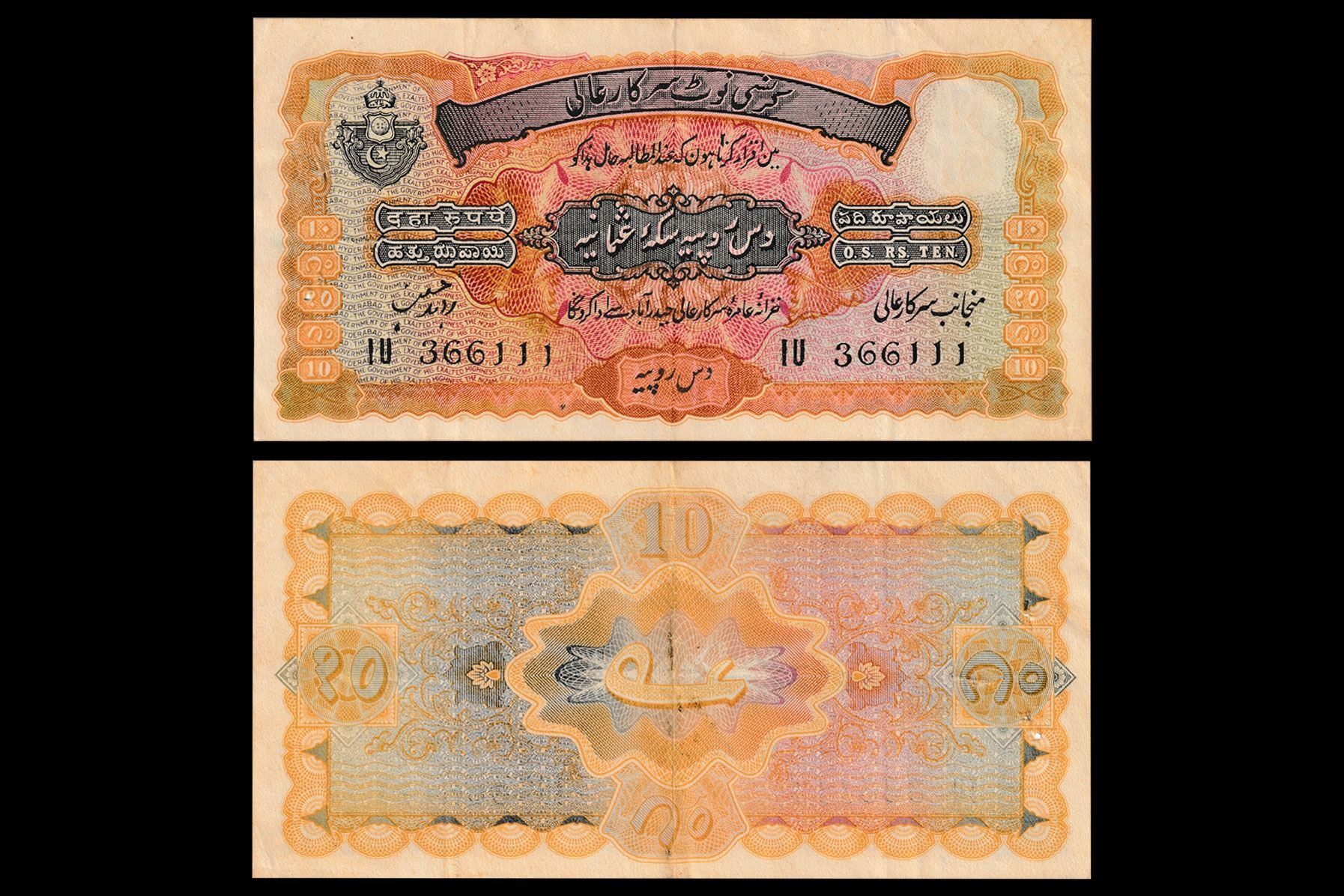 Hyderabad State, Ten Rupee, Signed by Zahid Hussain, 1945, IU 366111, Last Signature of Hyderabad note