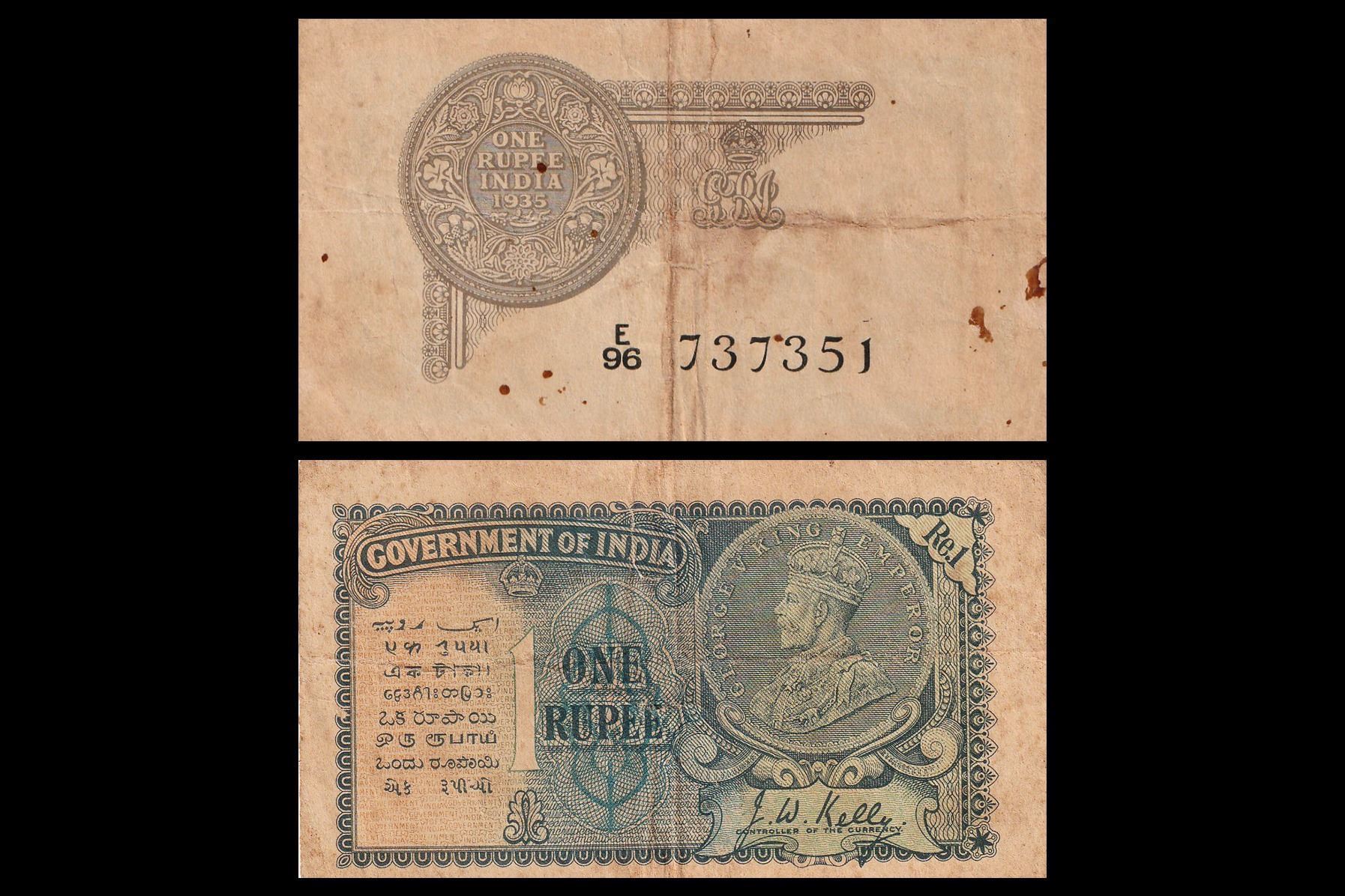 British India, George V, One Rupee, Signed by J.W. Kelly, E96 737351, None perforation Type, Very Fine+,
