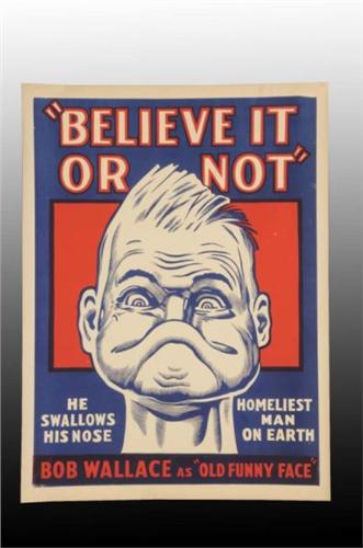 Description Circa 1940. Original poster featuring "Bob Wallace as Old Funny Face", the "Homeliest Man on Earth". Condition (Excellent). Size 21" x 28".