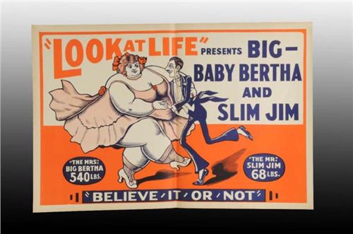 Description Circa 1940. Original poster featuring "Big Baby Bertha and Slim Jim". Condition (Excellent). Size 28" x 42".