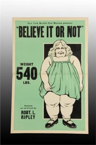 Description Circa 1940. Original poster depicting Big Baby Bertha Curtis. Poster from the 1939-40 New York World's Fair Museum. Condition (Excellent). Size 28" x 42".
