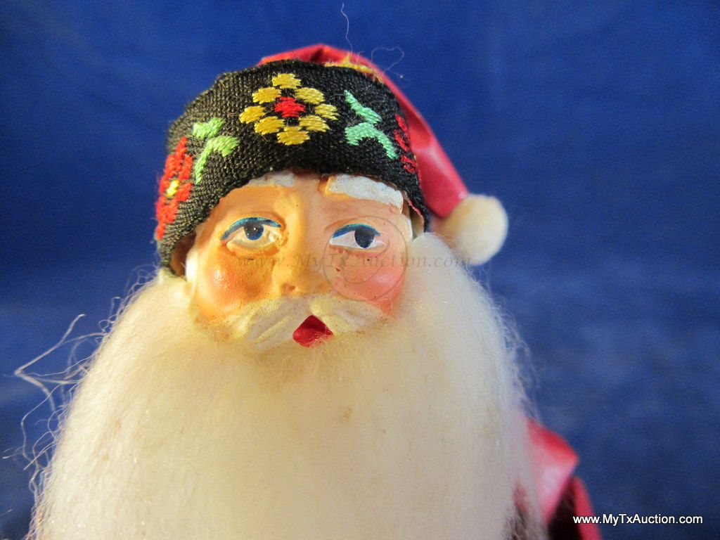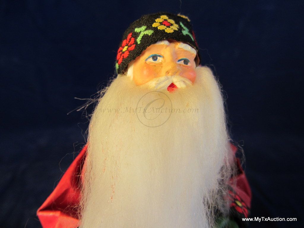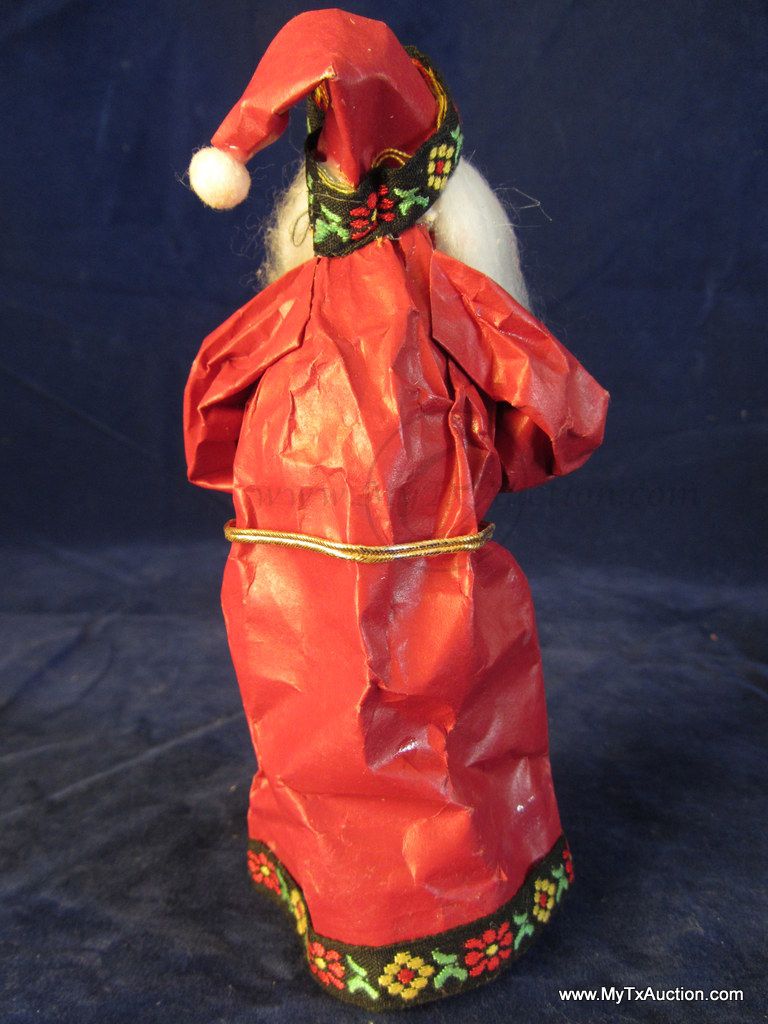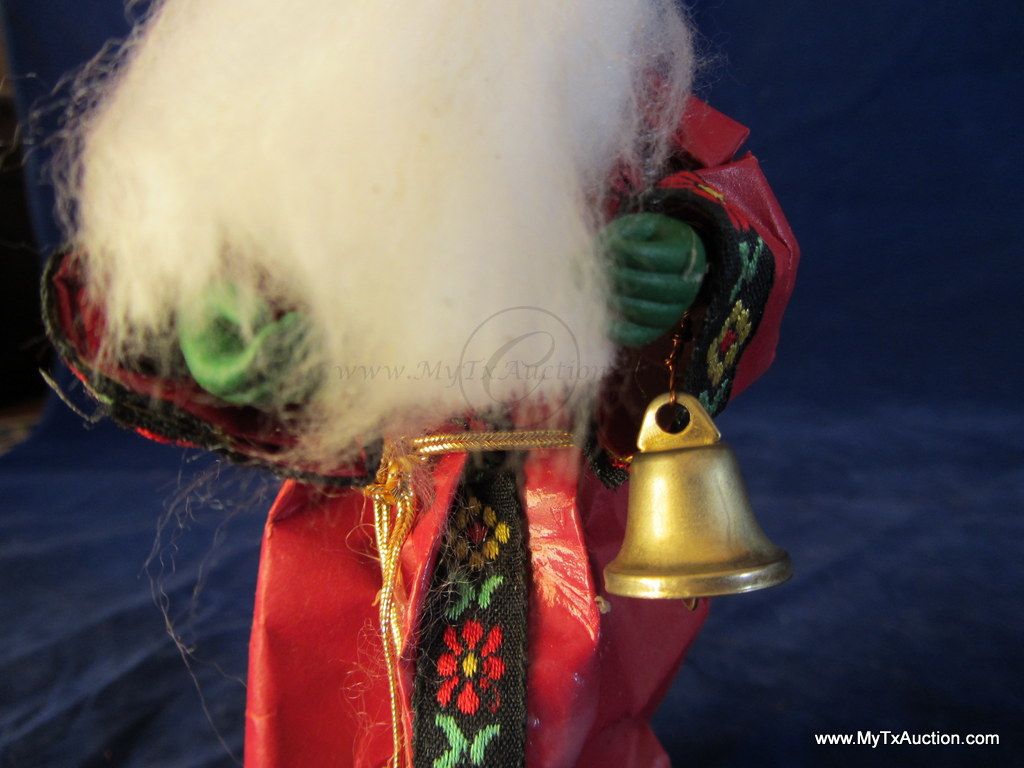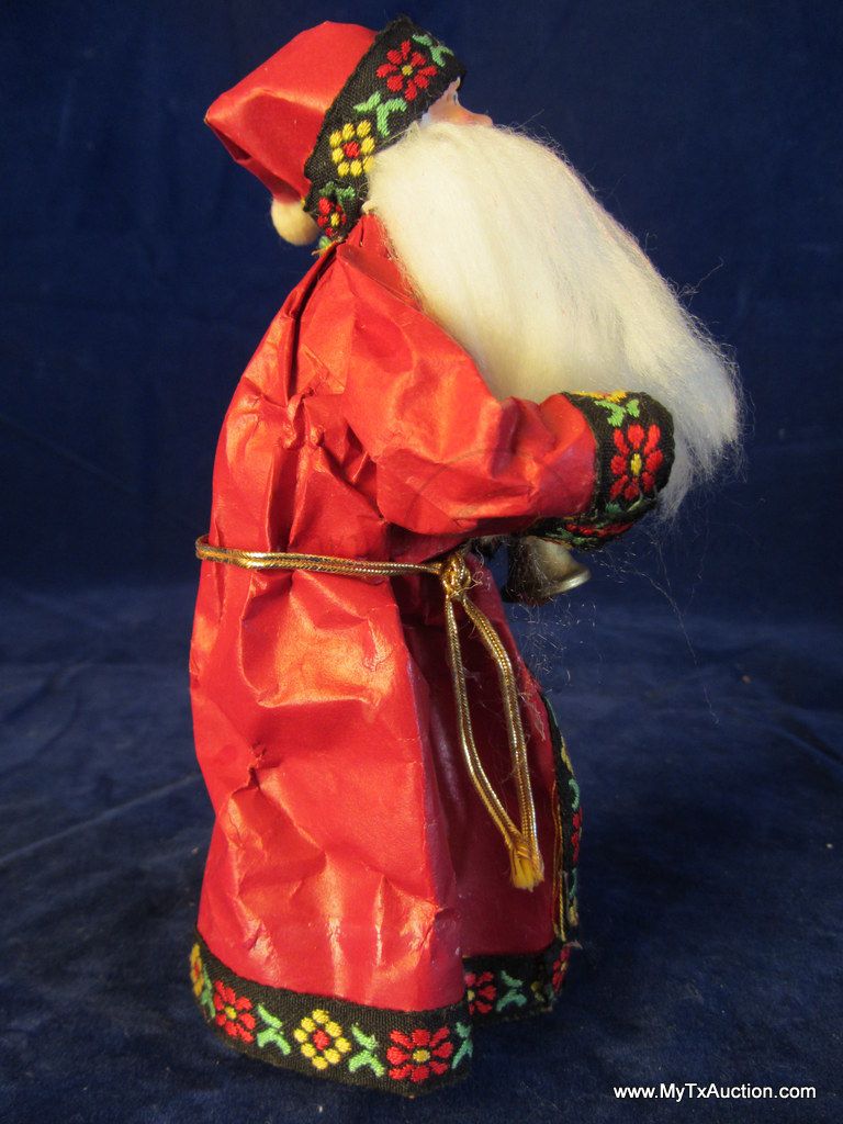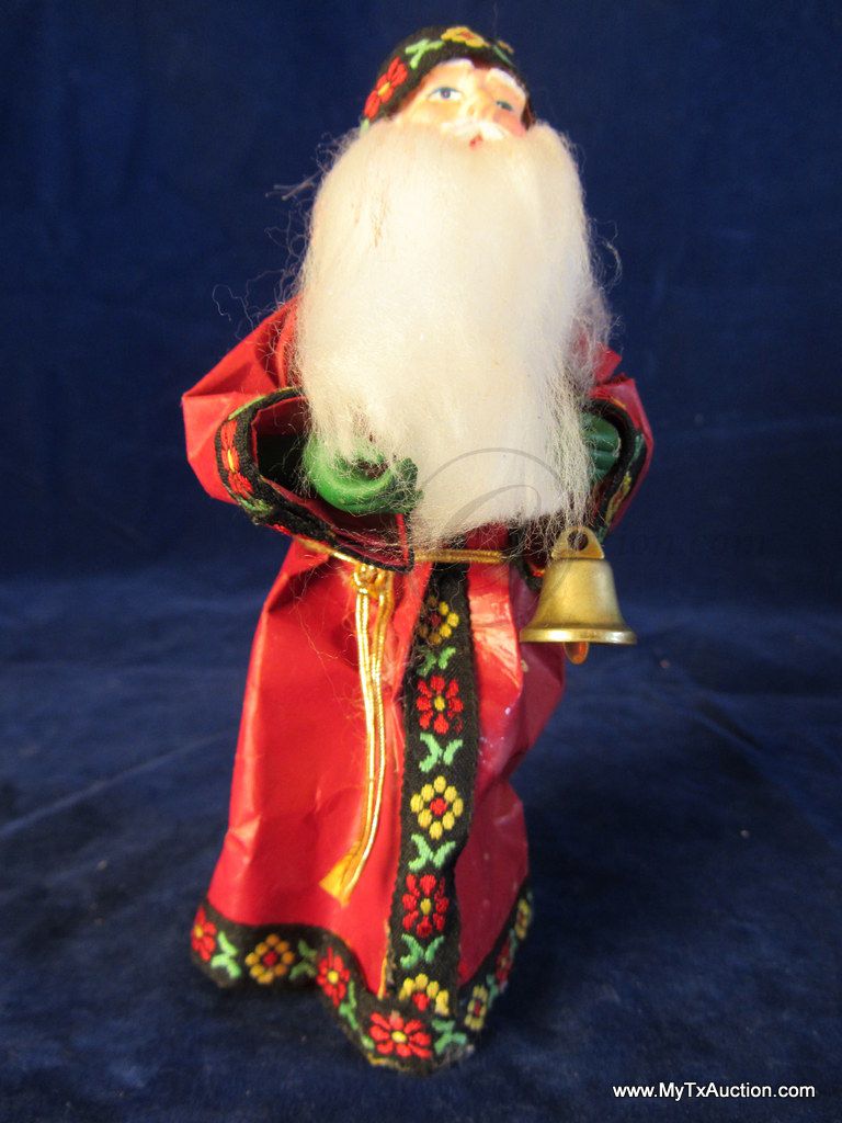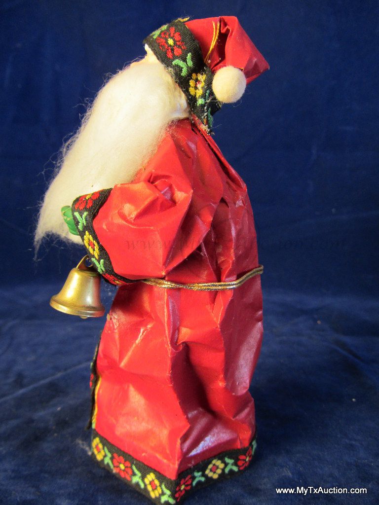 Olde Saint Nick stands approx. 6.25" tall. His robe is made of paper with material trim, he has plastic hands and face(very detailed) & he has a long flowing white beard. He holds a gold colored bell in his hand, has on green gloves and a gold cord belt. Very nice older piece.