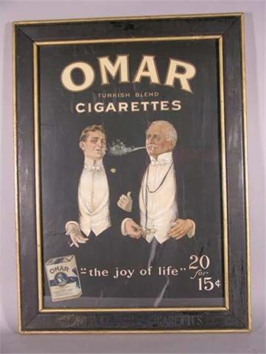 Paper sign for Omar Cigarettes in original frame, 18.5" x 25" some wrinkles and tears.