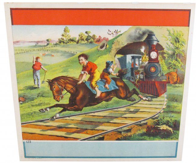 Paper Tobacco Bucket Label Calvert Litho Co. Detroit No. 123 depicting boys outrunning the train. Excellent condition. 13 1/4 X 10 3/4 inches.