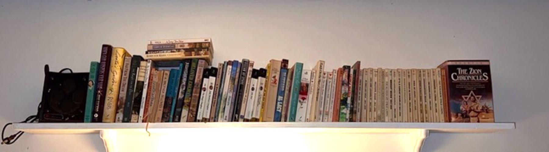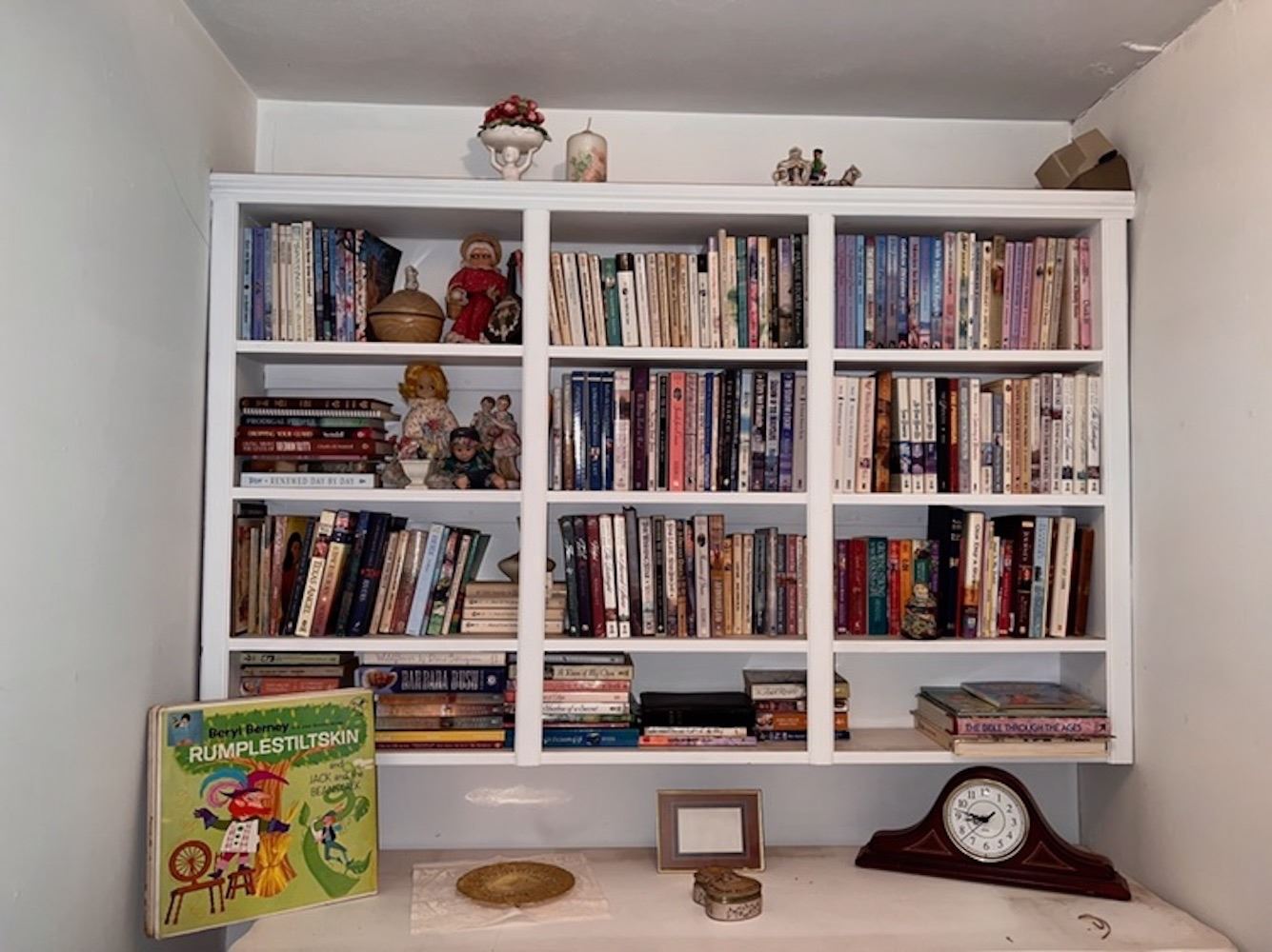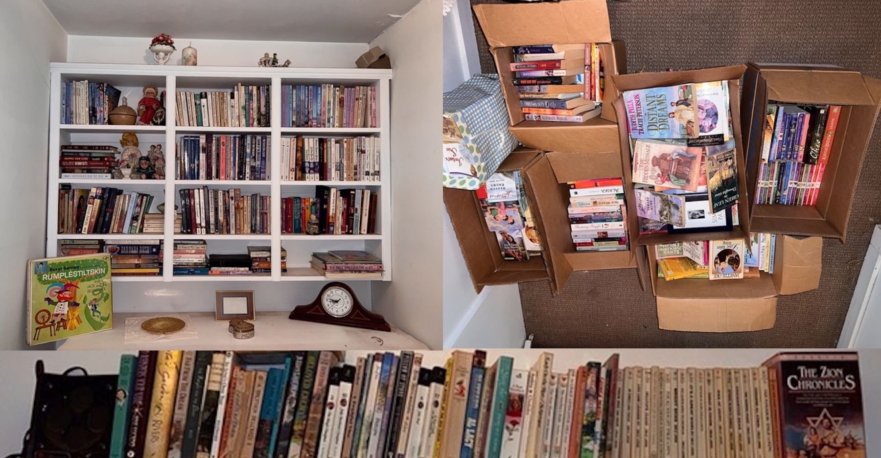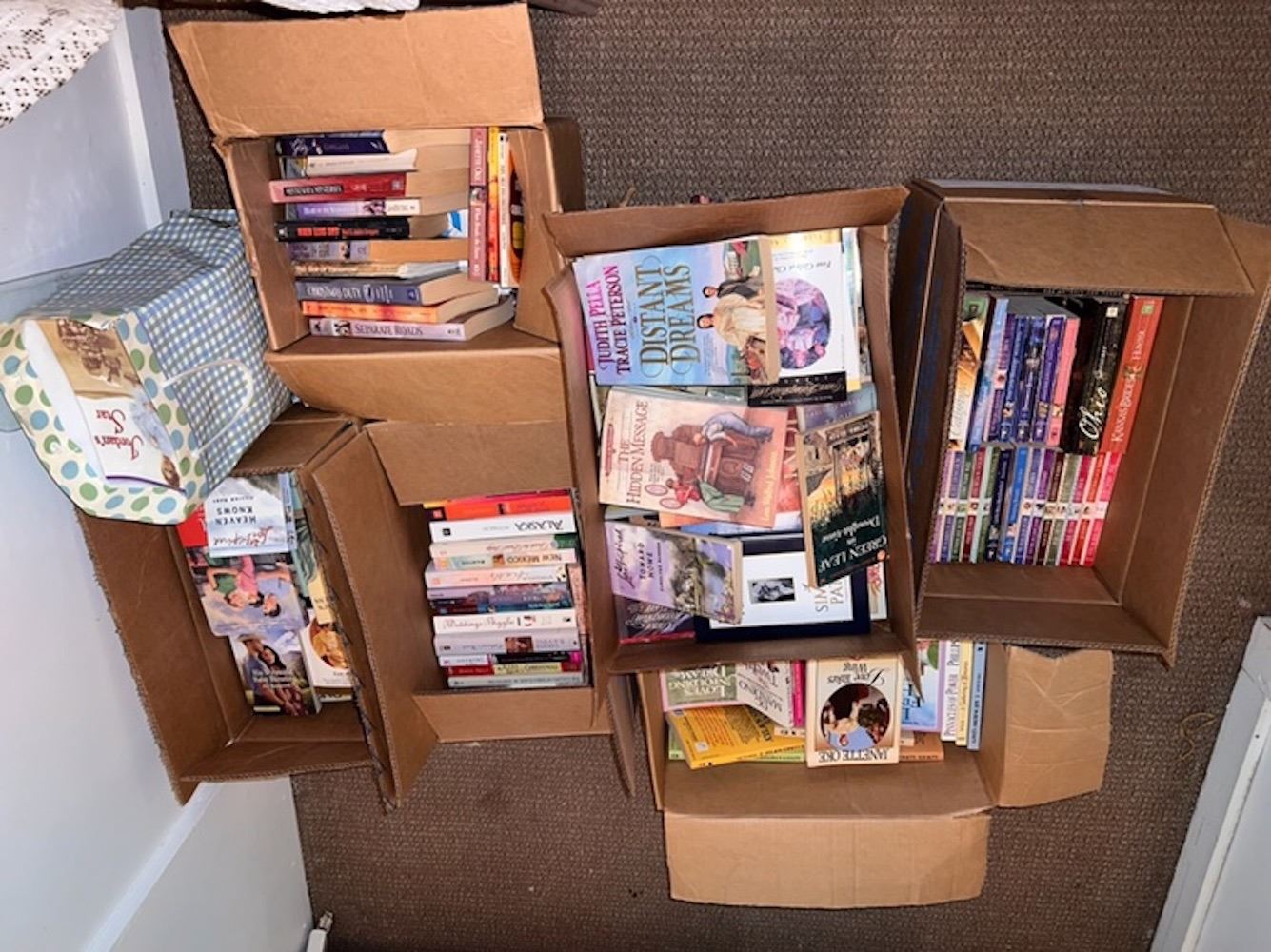 Paperback books and shelf goodies, boxes of paperbacks and additional shelf of books, from the lifetime collection