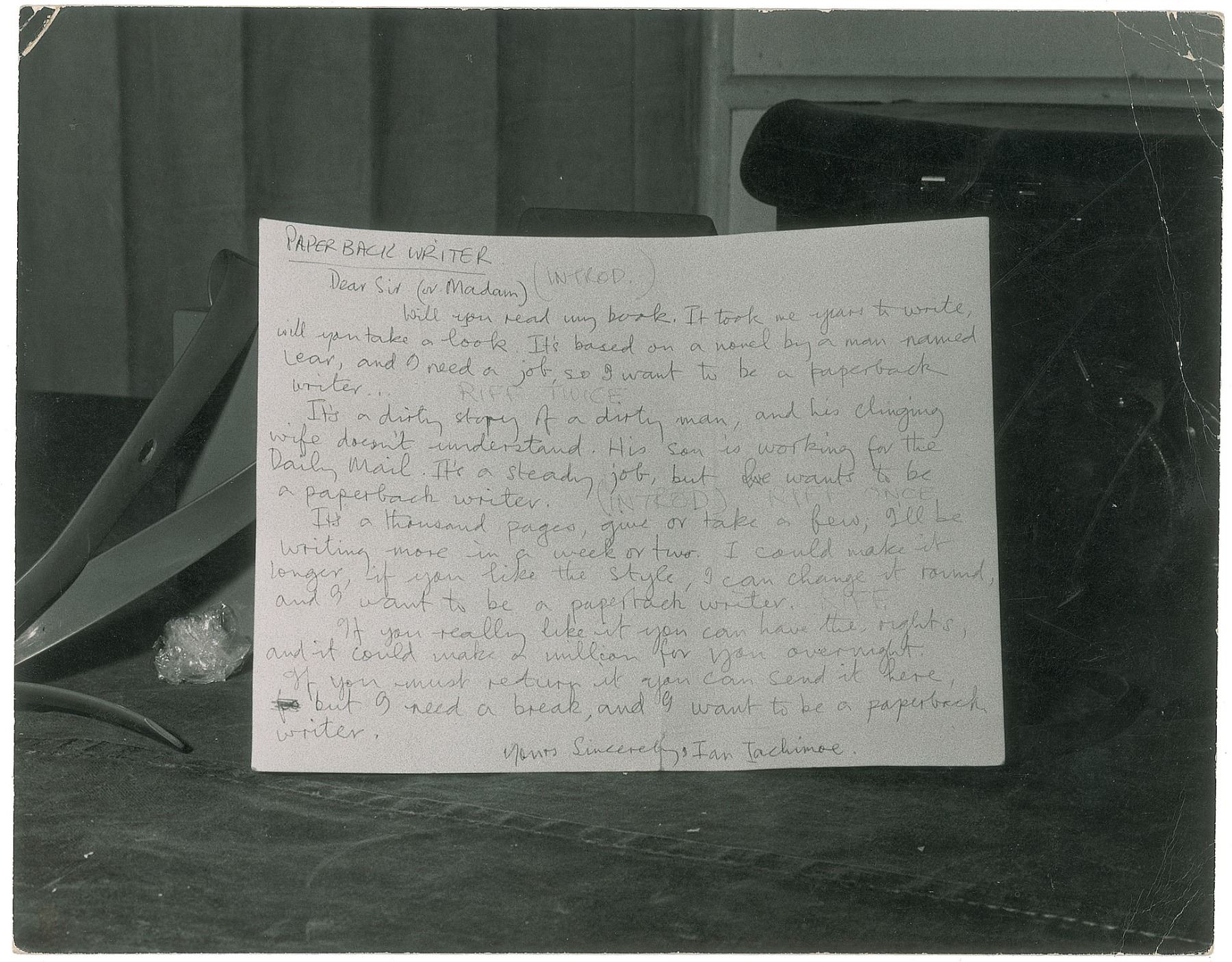 Wonderful original vintage matte-finish 9.75 x 7.5 silver gelatin photo of Paul McCartney’s handwritten lyrics to the song ‘Paperback Writer.’ The photograph was taken by Leslie Bryce, the photographer for The Beatles Monthly Book, during recording sessions that took place at EMI Studios, Abbey Road, London, on April 13 and 14, 1966. Reverse bears a Leslie Bryce credit stamp. In very good to fine condition, with creasing the corners and right edge. Accompanied by a certificate of authenticity from Tracks.