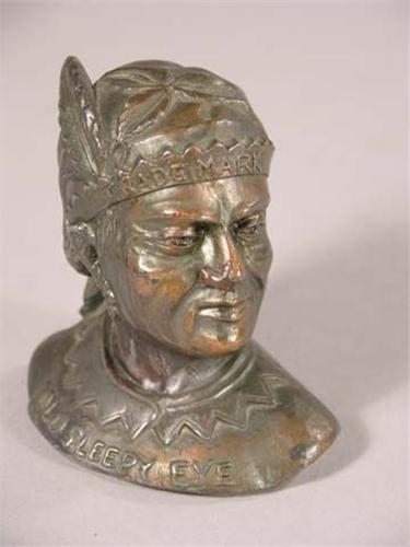 Pot metal paper weight for "Old Sleepy Eye Flour Co." Sleepy Eye, MN. 3" tall. Ex. cond.