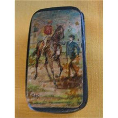 This antique papier mache snuff box has a beautiful horse and jockey design and the initials H.dep on the top. Sniffing snuff was the original method of taking tobacco, first used by the American Indians. Christopher Columbus noticed them sniffing a mysterious powder during his second voyage of discovery (1494-6) and brought the substance back to Europe. Snuff taking fast became the vogue among the Spanish and the French, although it only gained limited acceptance in England until Charles II brought the habit back from his exile in France. Boxes have been made from a wide variety of materials and we find today in private collections and museums, wonderful examples in gold and silver, brass and copper, pewter, jade and agate, mother-of-pearl, leather, papier mache, and numerous rare and beautiful woods. In very good plus condition it measures 1 inch high, 2 1/2 inches long and 1 3/8 inches wide. A great conversation piece and an addition to any Snuff Box or Tobacciana Collection. <BR>SH & Ins. will be quoted after orders placed. If you have questions feel free to contact me and thank you for looking.