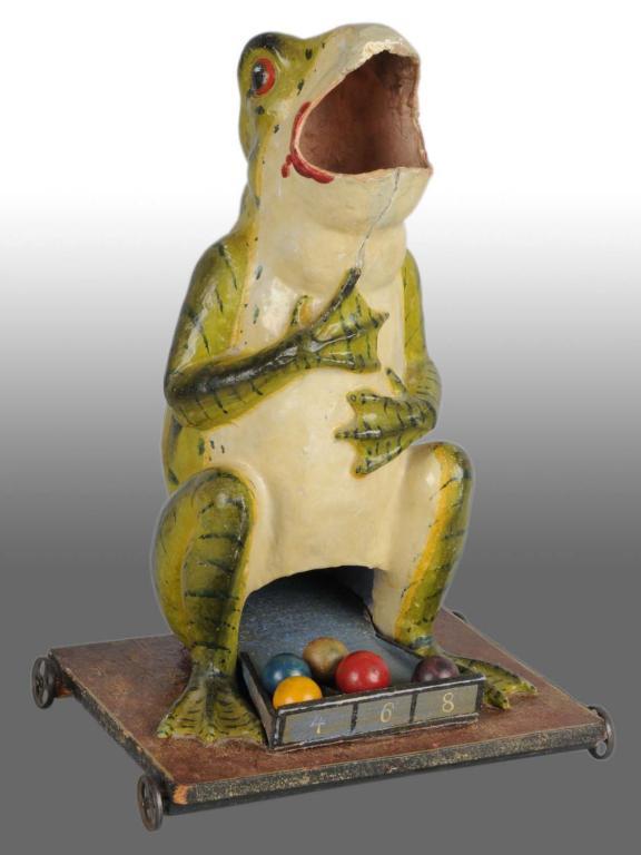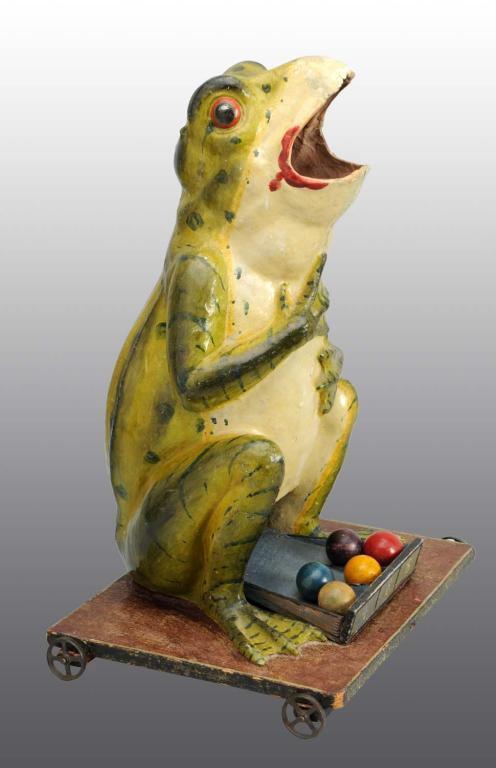 Description German. Highly detailed, painted frog sitting on wooden platform with metal wheels. Includes wooden balls to toss into open mouth of frog. Three-inch stable split on frog's lower jaw. Rare piece. Condition (Excellent). Size 19" T.