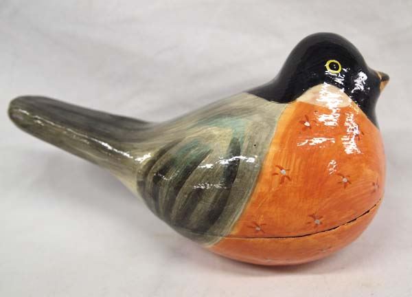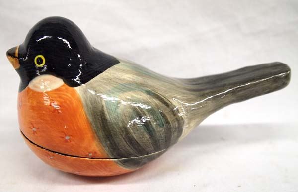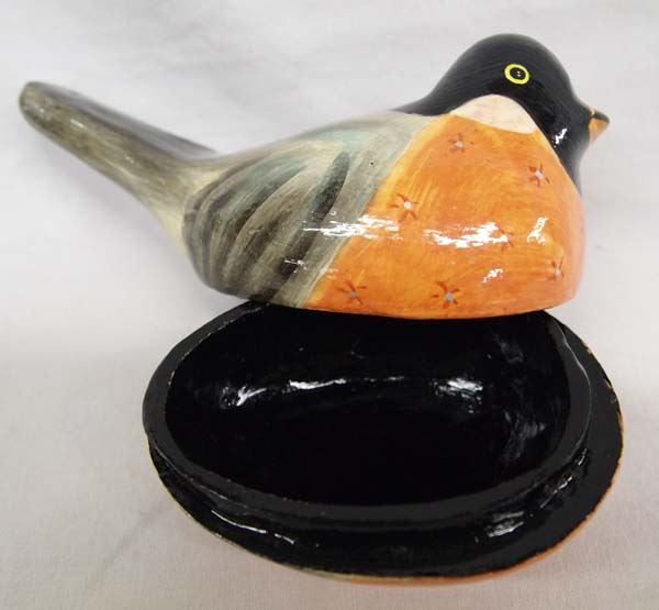 Papier Mache' Bird Shaped Lidded Trinket Box, measures 7''L x 3.5''W x 4''Deep, this traditional craft uses papier mache' and then a lacquer finish after hand painting the designs