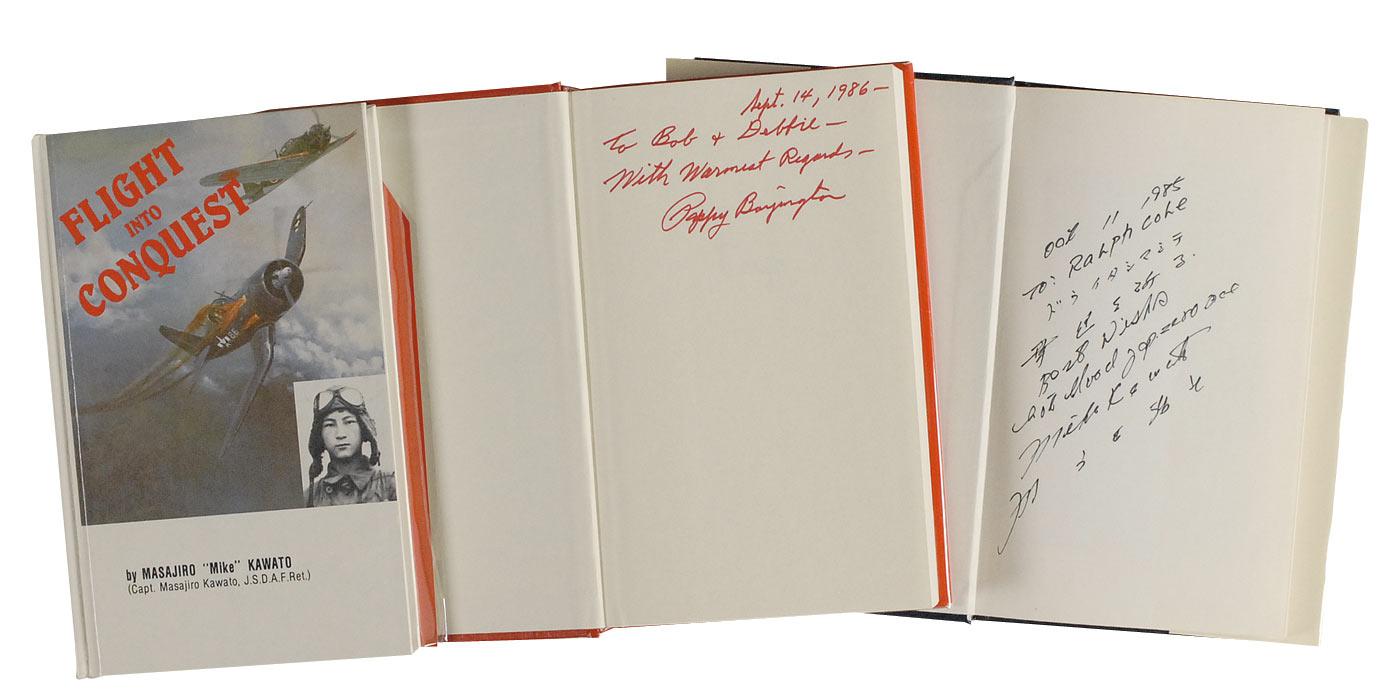 Three hardcover books: Tonya, signed and inscribed on the first free end page in red felt tip by Boyington; Bye Bye Black Sheep, signed and inscribed on the first free end page in English and Japanese by Kawato; and Flight into Conquest, also signed and inscribed on the first free end page in English and Japanese by Kawato. In fine overall condition.