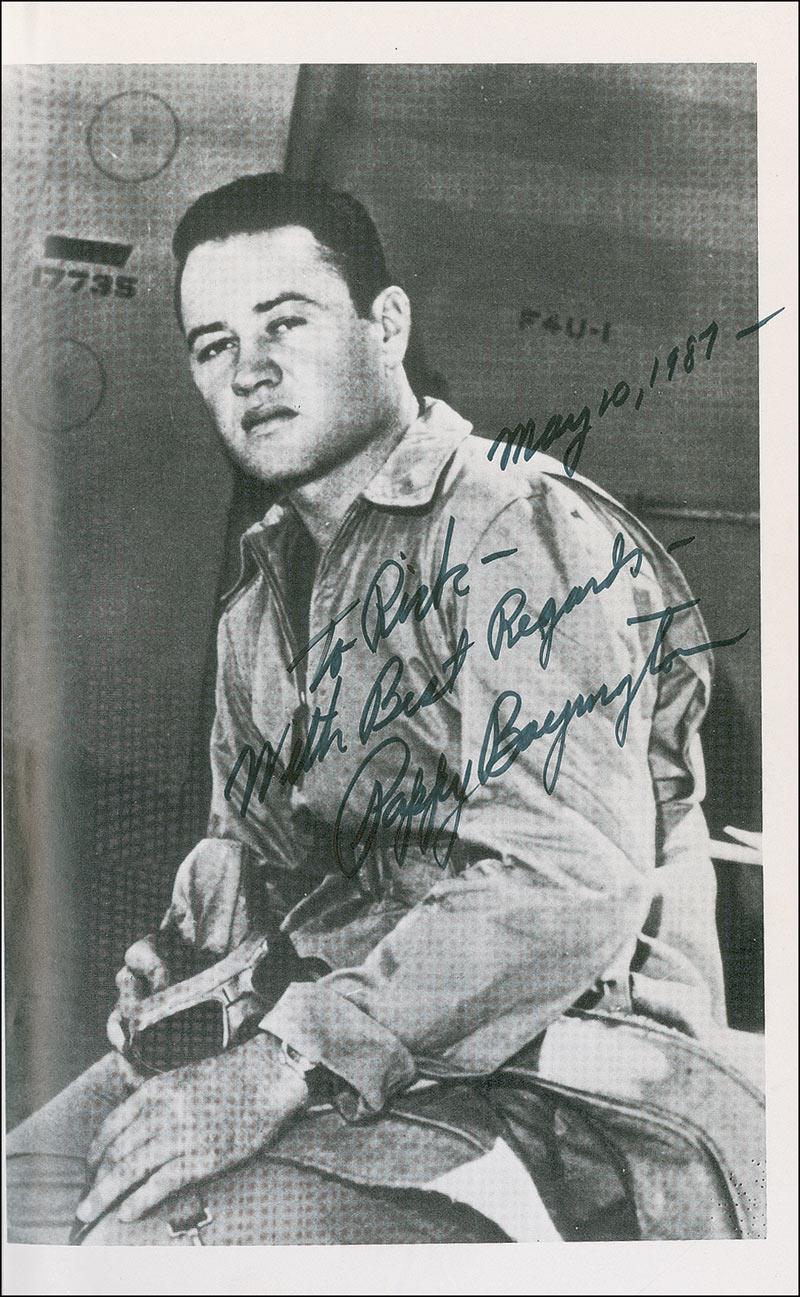 Signed book: Baa Baa Black Sheep. Later printing. Fresno: Wilson Press, Inc., 1958. Hardcover with dustjacket, 5.75 x 8.75. Signed and inscribed in black felt tip on a photo before the title page, “May 10, 1987, To Rick—With Best Regards—Pappy Boyington.” Some soiling to the end pages, a crease to the spine, wear to the boards, and rubbing to the head and heel of the spine, otherwise fine condition. The dustjacket shows mild to moderate wear with creasing and small tears.