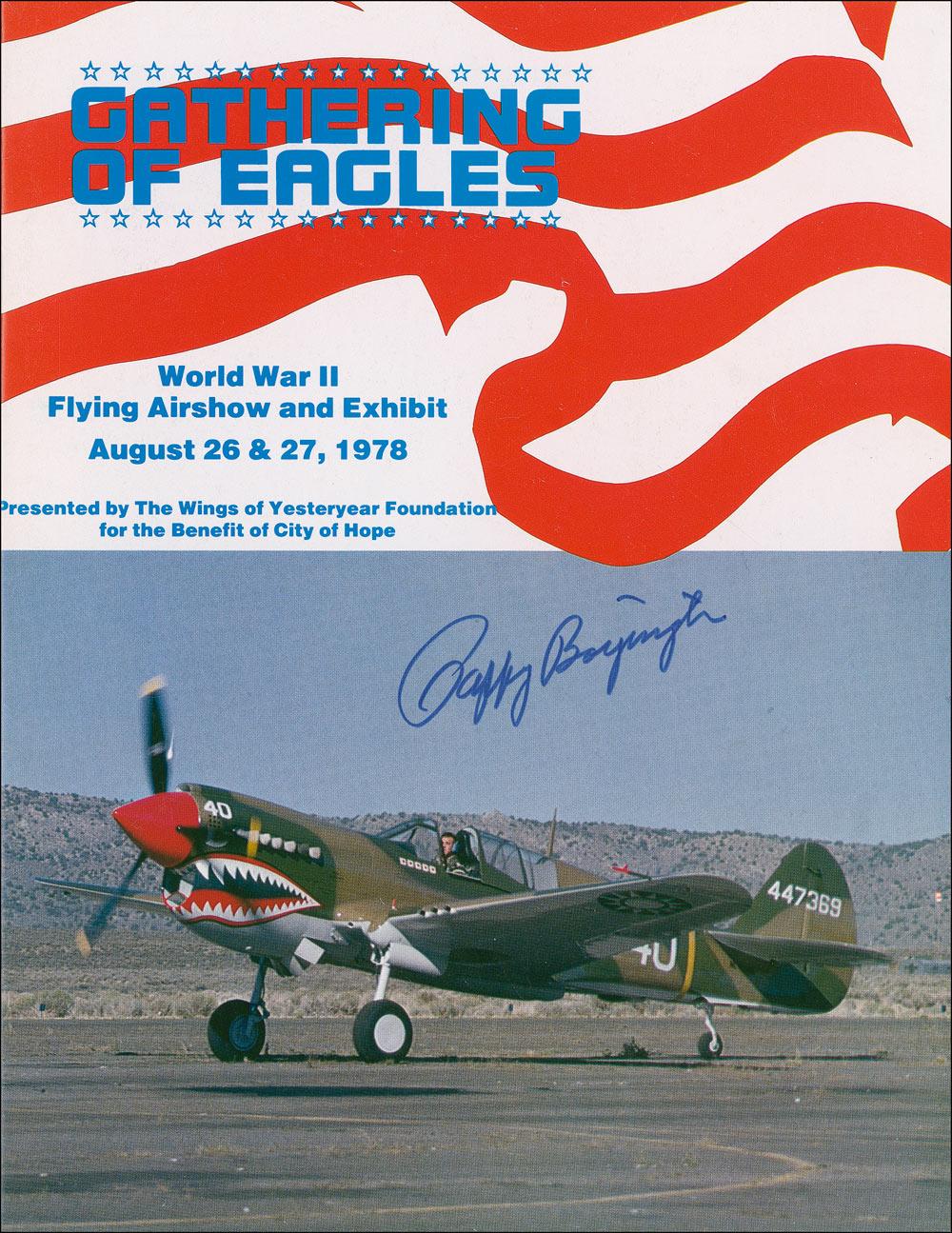 Souvenir program for Gathering of Eagles, a World War II Flying Airshow and Exhibit, 8.5 x 11, August 26 and 27, 1978, signed in blue felt tip on the front cover “Pappy Boyington.” In fine condition.