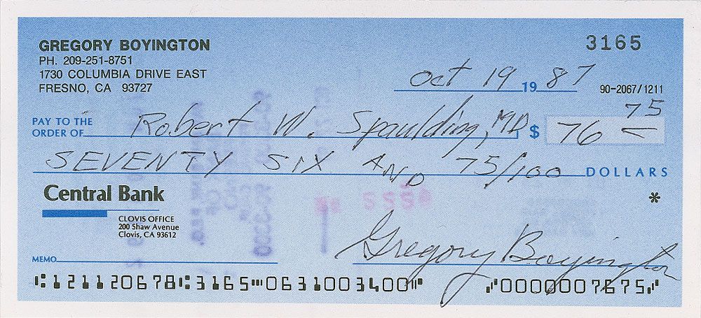 Personal check, 6 x 2.75, filled out and signed by Boyington, “Gregory Boyington,” payable to Robert W. Spalding, M.D. for $76.75, October 19, 1987. In fine condition, with light show-through from stamps on reverse.