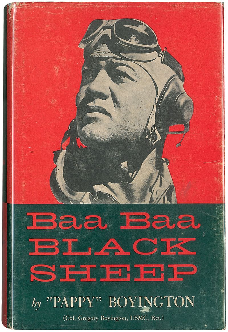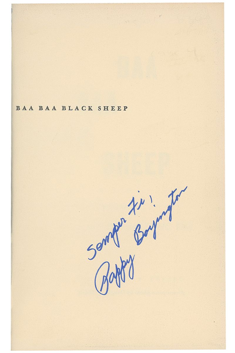 Signed book: Baa Baa Black Sheep. Later printing. Fresno: Wilson Press, Inc., 1958. Hardcover with dustjacket, 5.75 x 8.75, 384 pages. Signed on the half-title page in blue felt tip, “Semper Fi! Pappy Boyington.” Scattered light wear and rubbing to dustjacket, as well as clipped corners, otherwise fine condition.