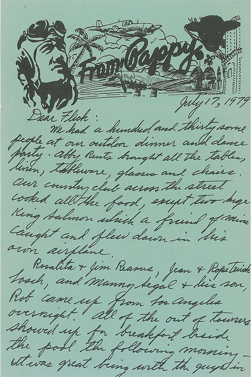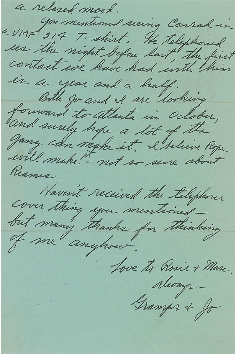 ALS signed “Gramps,” one page both sides, 6 x 9, personal letterhead, July 17, 1979. Letter to his grandchild about a party. In part: “Our country club across the street cooked all the food, except two huge king salmon which a friend of mine caught and flew down in his own airplane…You mentioned seeing Conrad in a VMF 214 T-shirt. He telephoned us the night before last, the first contact we have had with him in a year and a half.” In fine condition, with scattered creases.