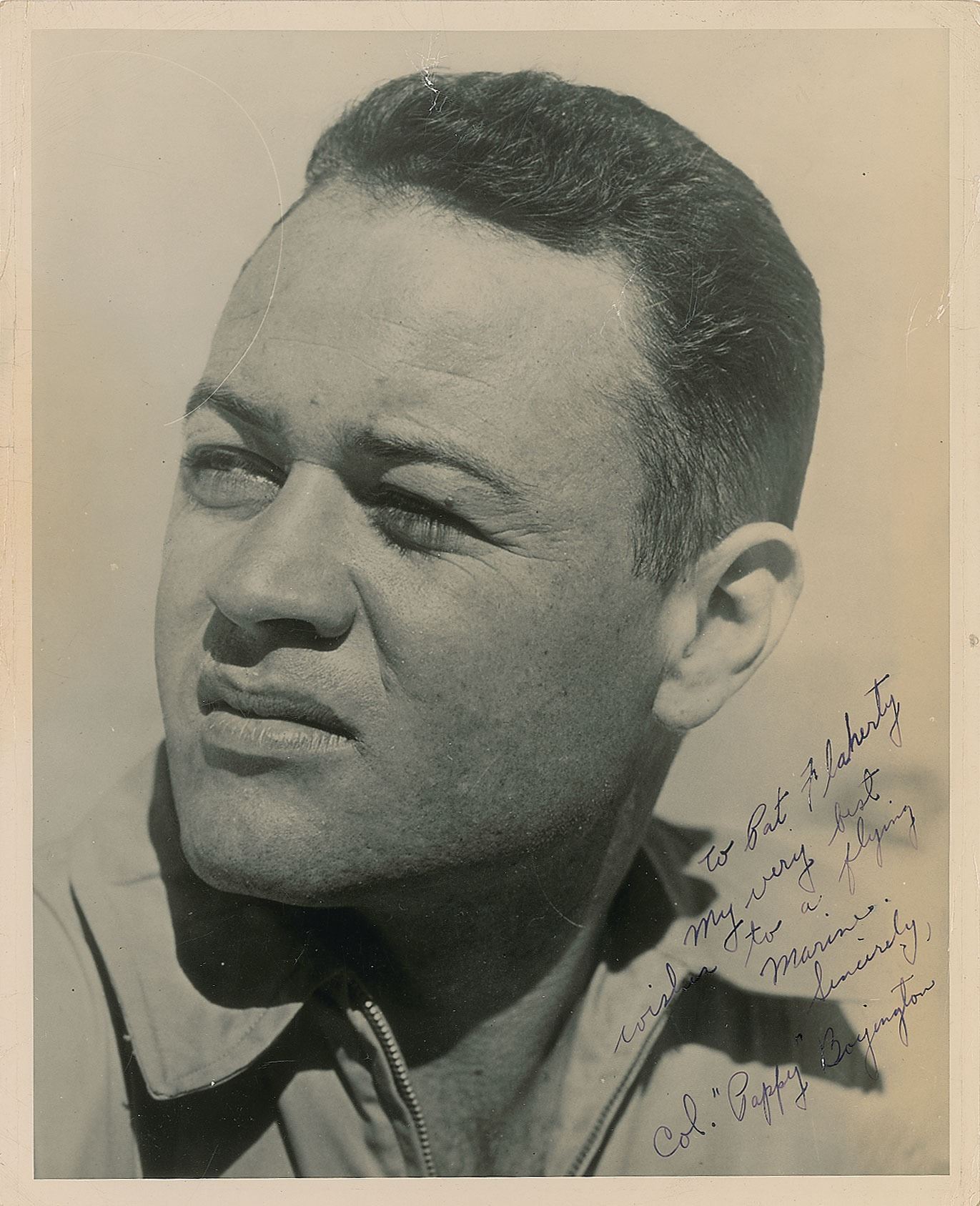 Vintage glossy 8 x 10 close-up photo of the legendary fighter ace, signed and inscribed in fountain pen, "To Pat Flaherty, My very best wishes to a flying Marine. Sincerely, Col. 'Pappy' Boyington.” Reverse bears a USMCAS Miramar stamp. In very good condition, with overall creasing and a Beckett label affixed to the reverse. Accompanied by a certificate of authenticity from Beckett Authentication Services.