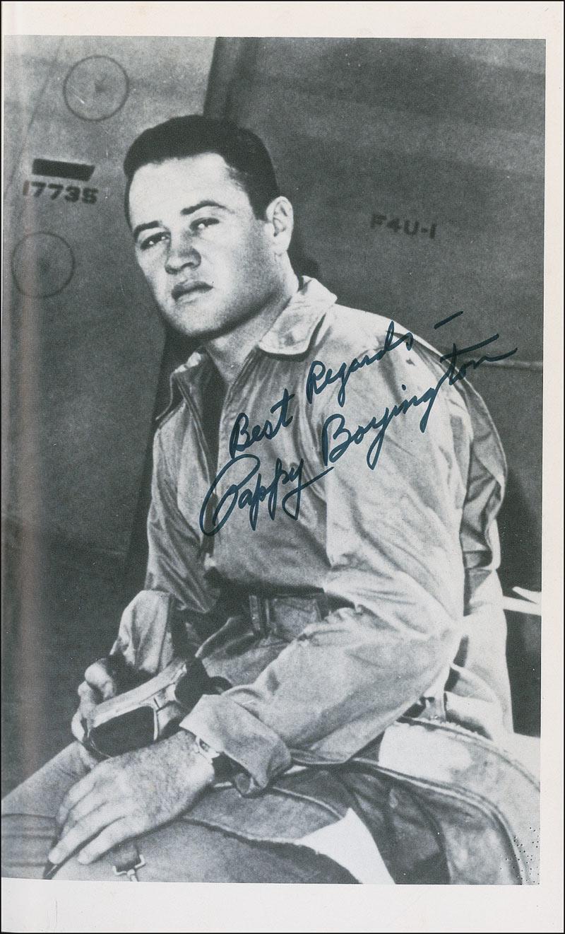 Signed book: Baa Baa Black Sheep. Later printing. Fresno: Wilson Press, Inc., 1958. Hardcover with dustjacket, 5.75 x 8.75, 384 pages. Signed in black felt tip on the frontis photo, “Best Regards–Pappy Boyington.” In very good condition, with light soiling, library stampings to two interior pages and the fore edge, missing the final end page, and sunning to the dustjacket’s spine, which also bears a library marking. RRAuction COA.