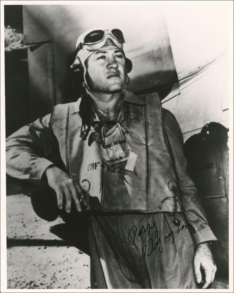 Glossy 8 x 10 photo of Boyington leaning on his plane, signed in black felt tip. In very fine condition. RRAuction COA.