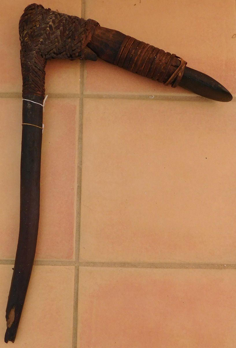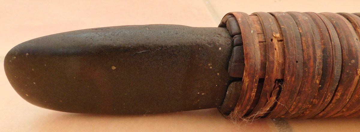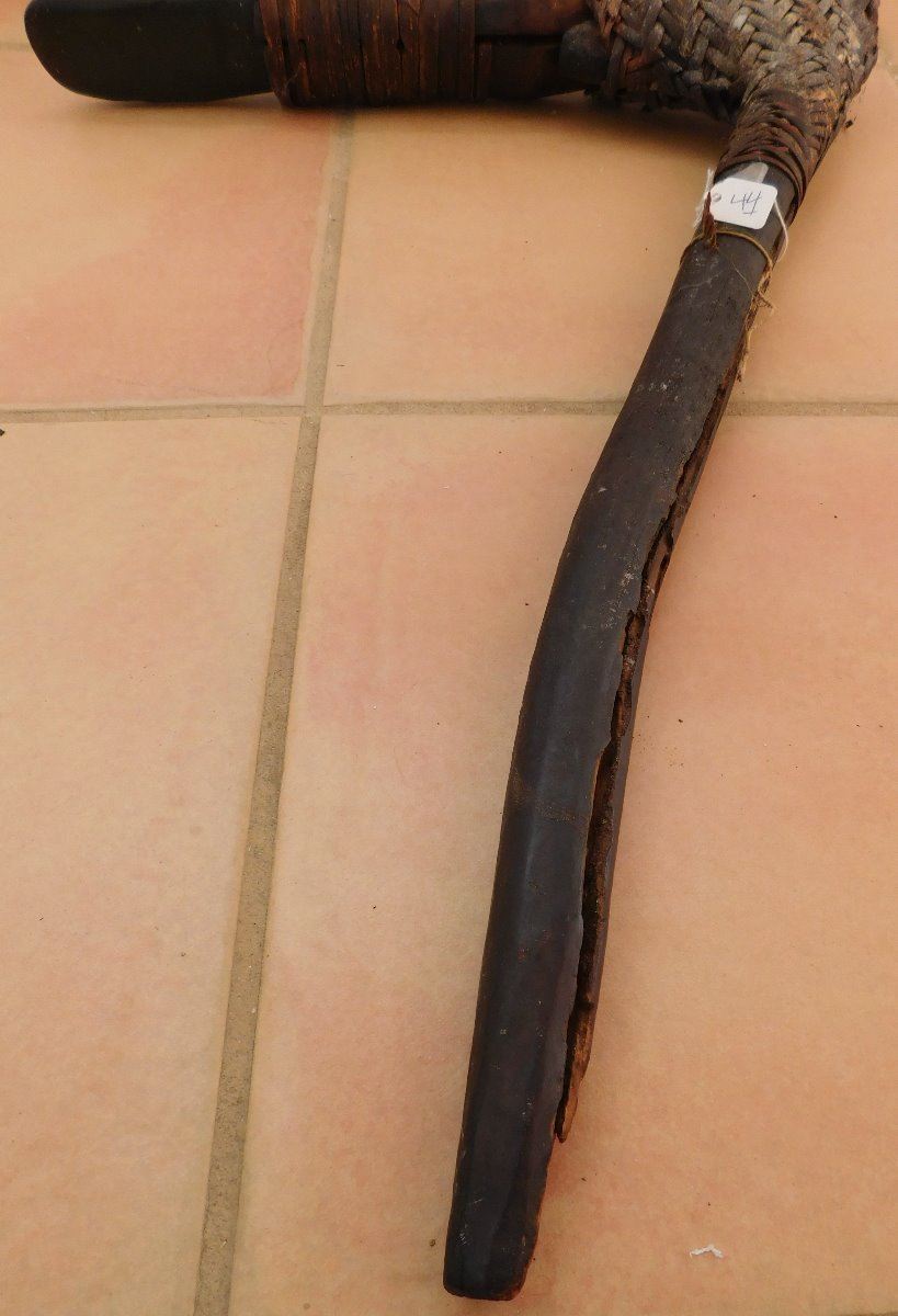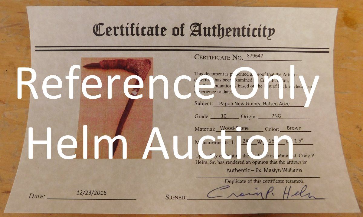Papua New Guinea Hafted Adze, circa WWII. Made of wood, ratan and jade, the item measures 24" x 16" x 1.5". PNG. Collected in WWII, may have been old then. Ex. Maslyn Williams, author of Stone Age Island. Helm Certificate of Authenticity. Condition: Good, see images. Shipping: $45.00, due to size, w/insurance and signature.