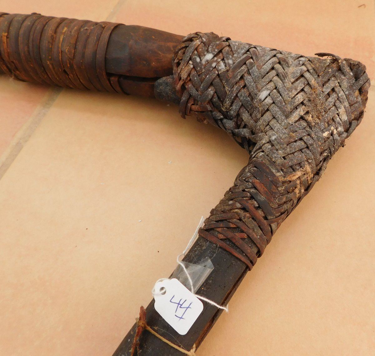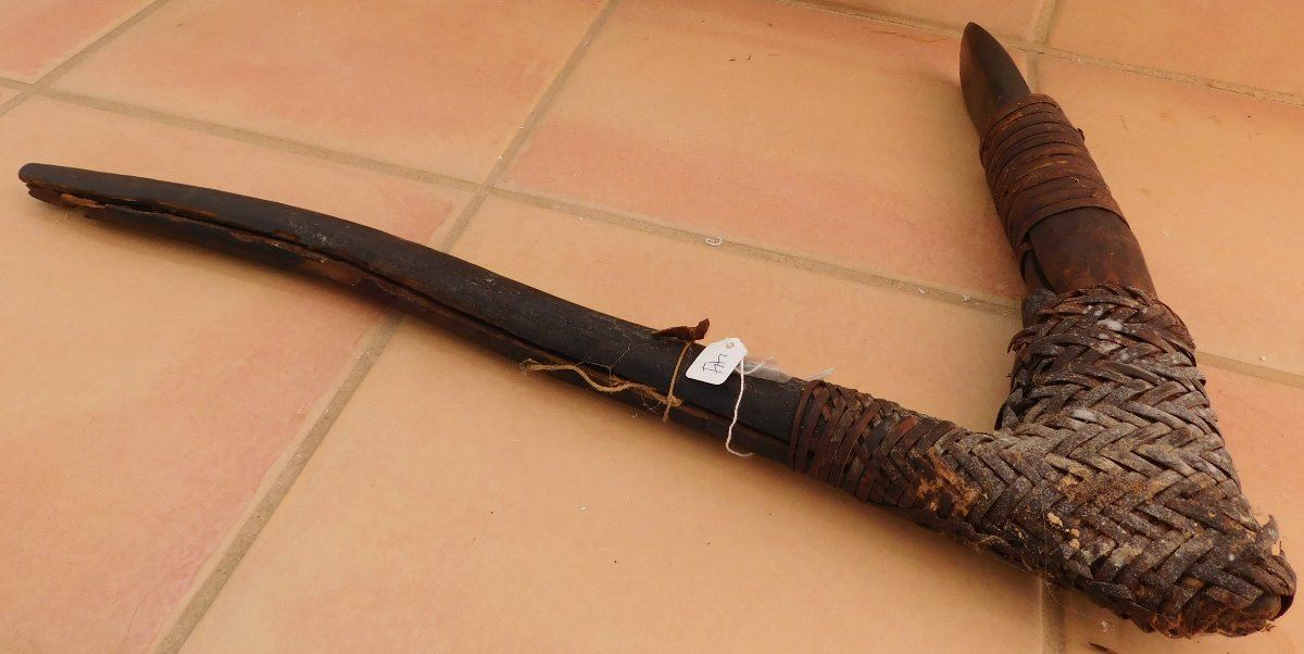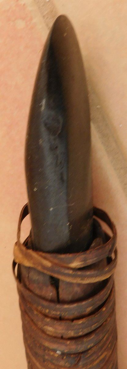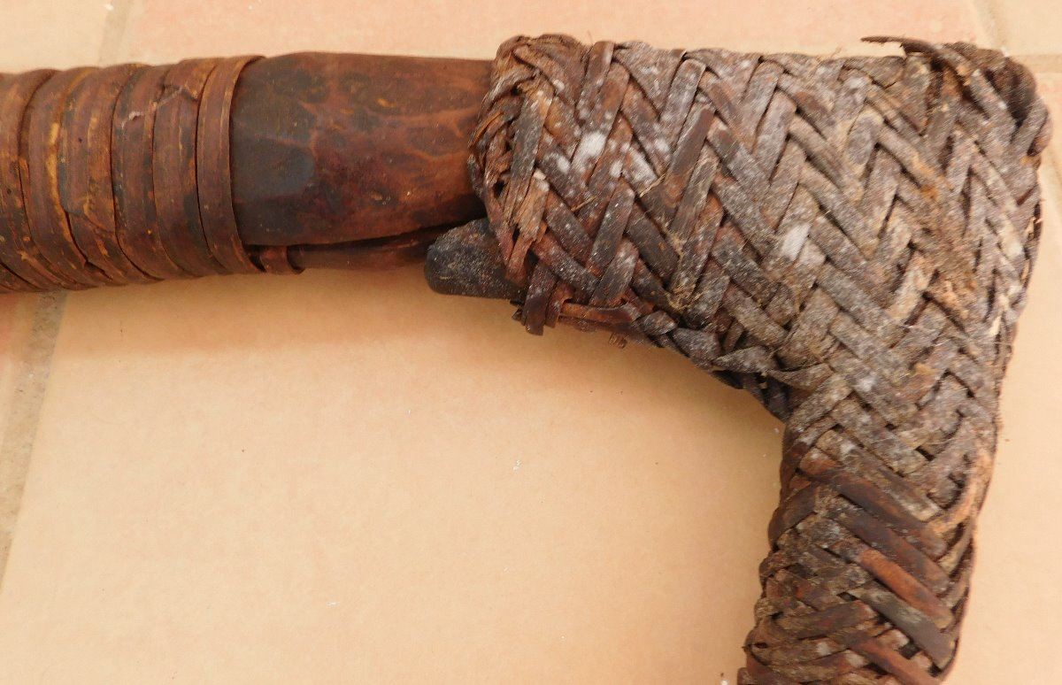 Papua New Guinea Hafted Adze, circa WWII. Made of wood, ratan and jade, the item measures 24" x 16" x 1.5". PNG. Collected in WWII, may have been old then. Ex. Maslyn Williams, author of Stone Age Island. Helm Certificate of Authenticity. Condition: Good, see images. Shipping: $45.00, due to size, w/insurance and signature.