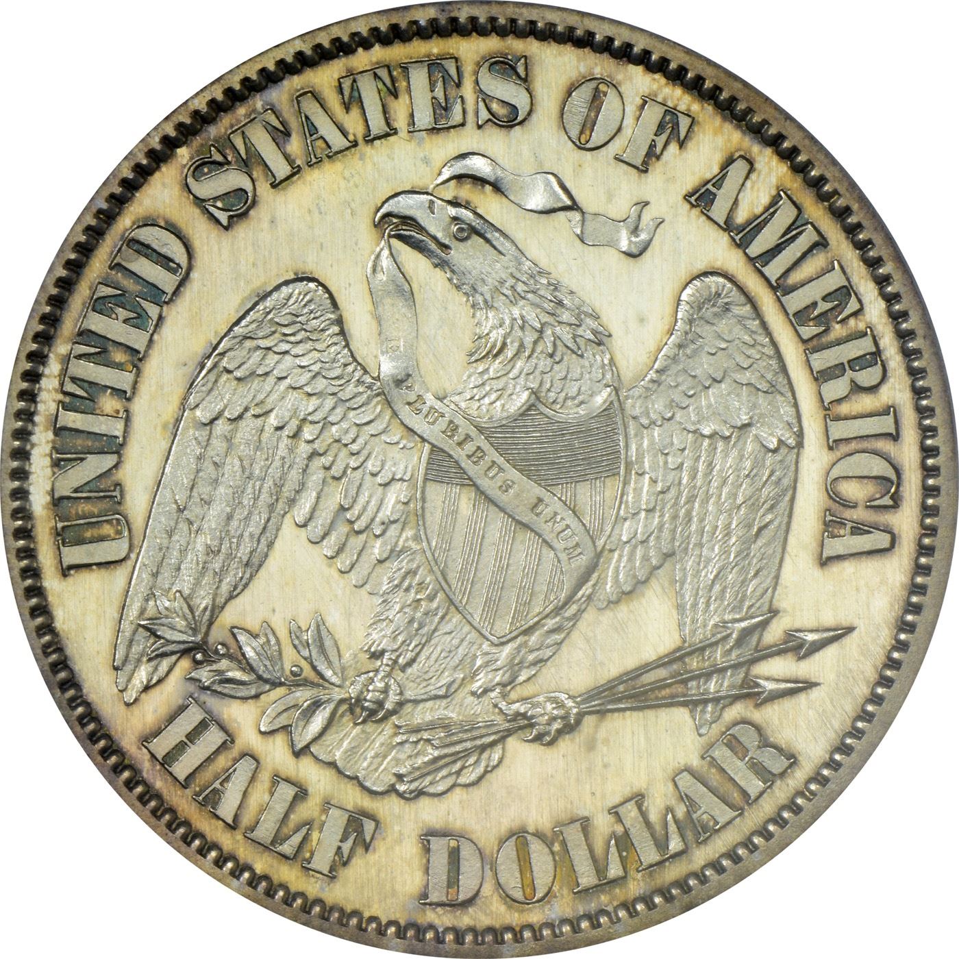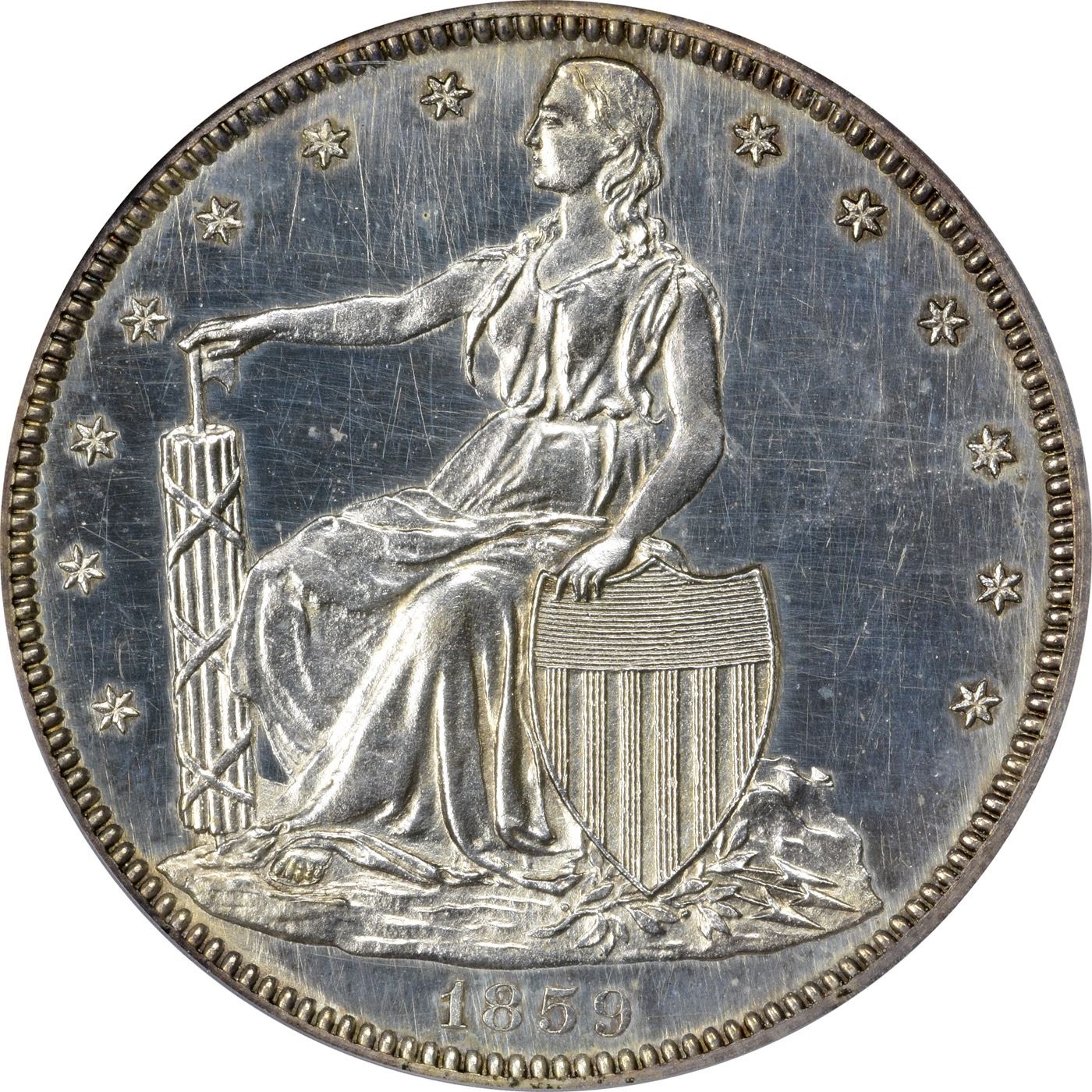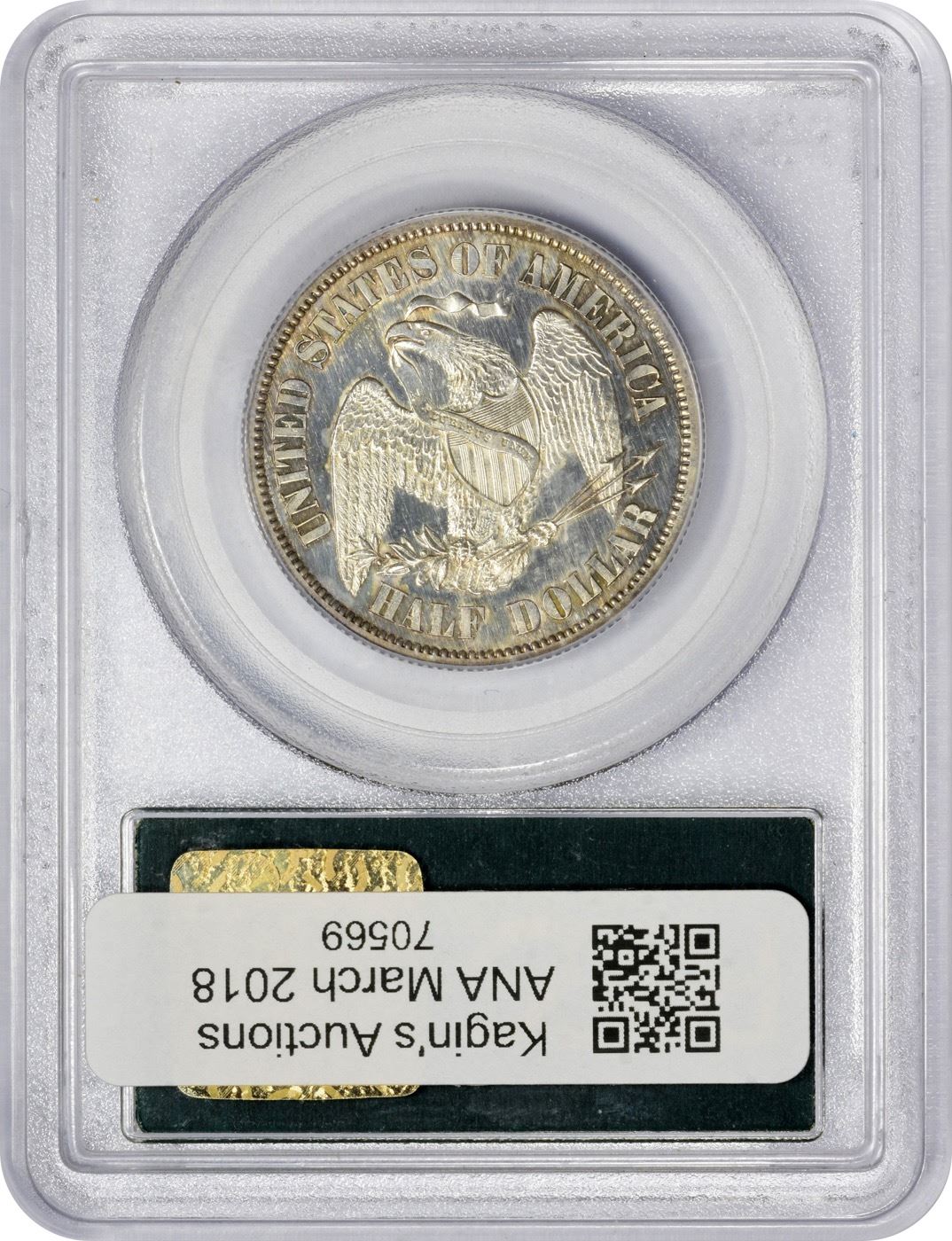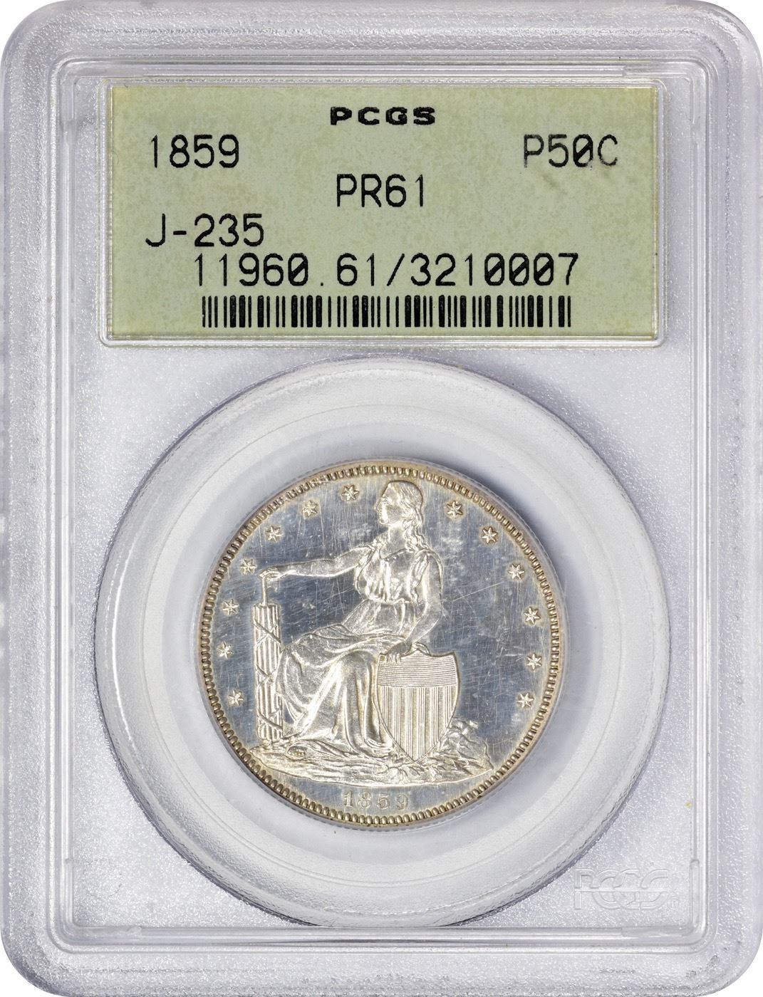 Paquet’s Pattern 1859 Half Dollar 1859 Pattern Half Dollar. Judd-235, Pollock-282. Silver. Reeded Edge. Coin Turn. Rarity-5. Proof-61 PCGS. OGH. Obv: Anthony Paquet’s austere and solidly upright depiction of Liberty, seated left with left hand on shield, right hand on fasces, 13 stars around, date below. Obv: perched eagle on branch and arrows, ribbon in beak drapes shield, E PLURIBUS UNUM on ribbon, UNITED STATES OF AMERICA HALF DOLLAR around, the letters all done in the engraver’s tall, “stretched” style. Largely brilliant throughout with a trace of golden toning at the obverse rim, and with similar toning appearing somewhat bolder on the reverse. A solid example of the date and grade combination. Housed in a PCGS OGH with frame around border.