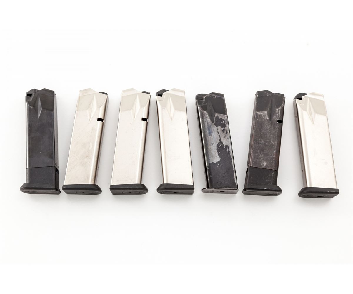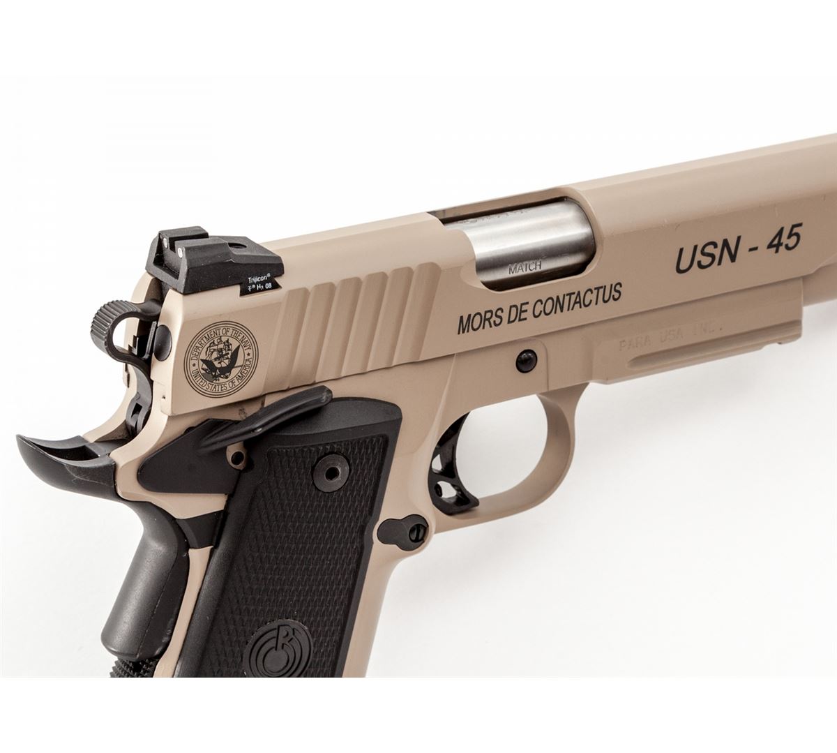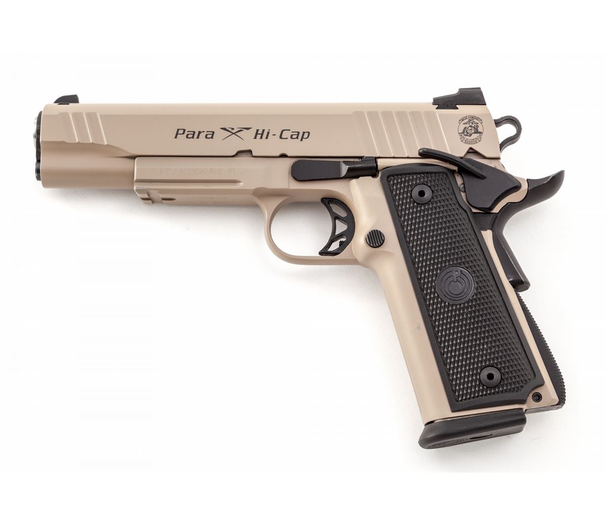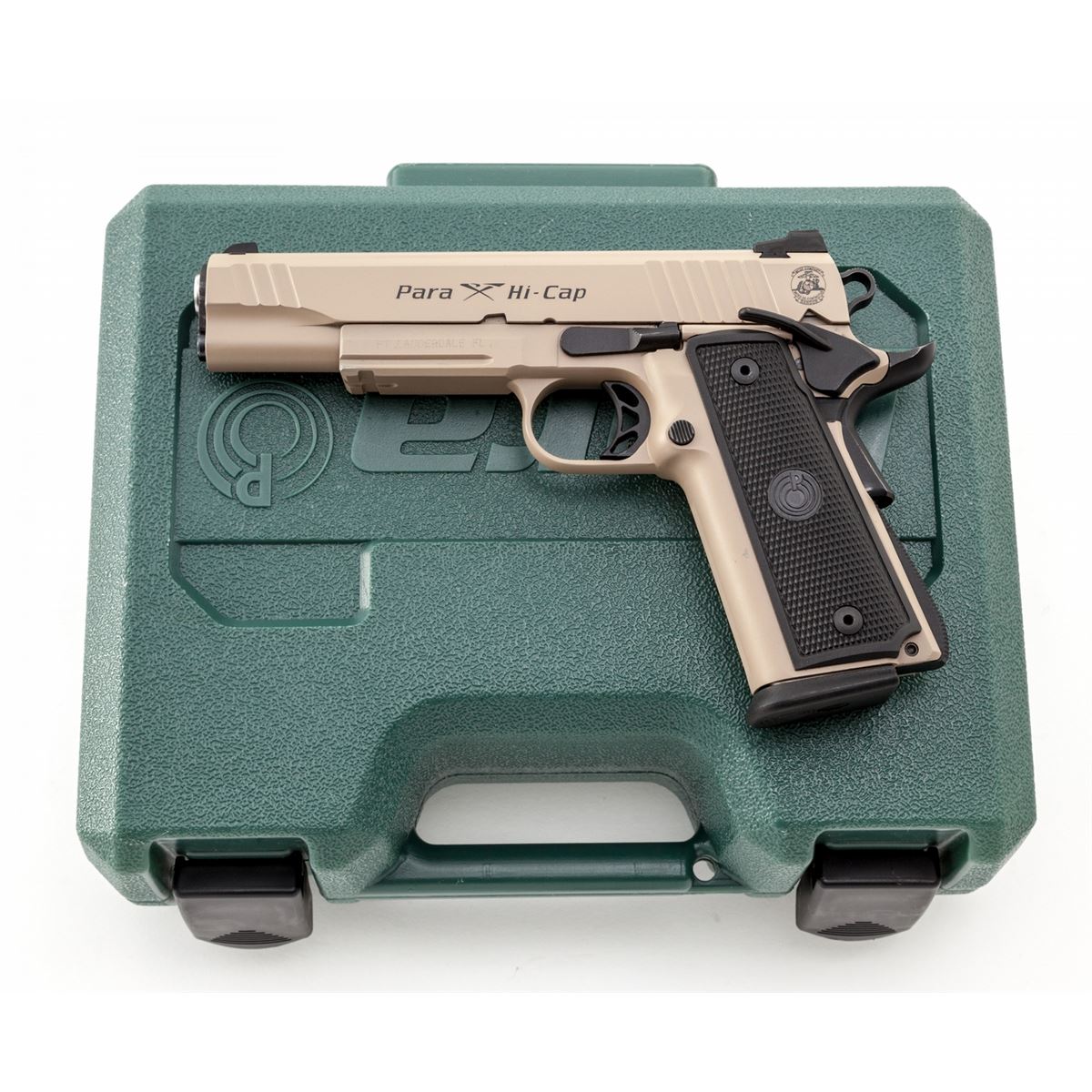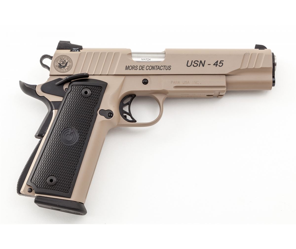 Para Hi-Cap Semi-Automatic Pistol, #P189607, .45 ACP cal., 5'' barrel, coyote brown/black finish, right side of frame marked ''USN-45 'Mors De Contactus'''; left side marked ''MCSF Company - Bangor'' with Marine Corps insignia. Condition is excellent showing little use, in original box with three (3) high-cap magazines, plus five (5) extra mags as well. Est.: $1,000-$1,500. (Modern/PPT) (High-cap mags not available to California residents.)