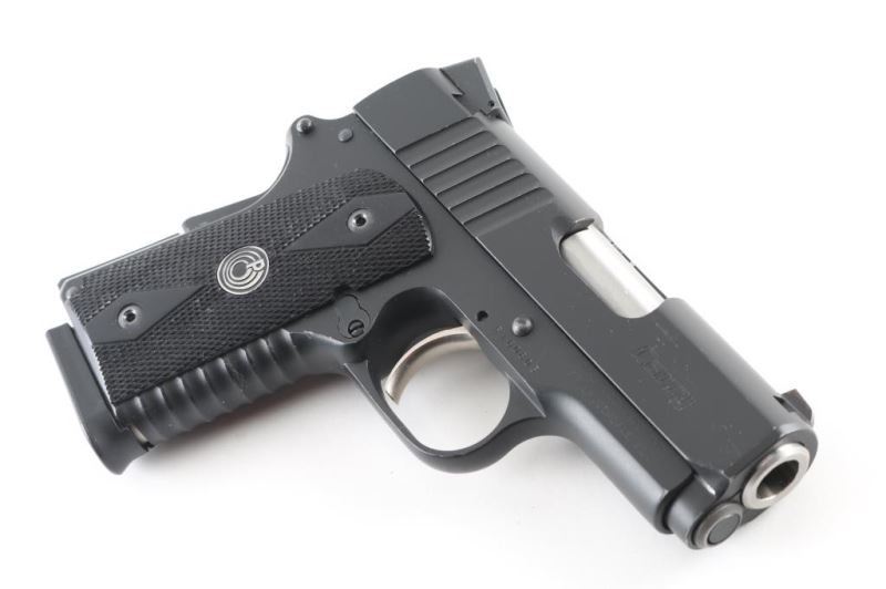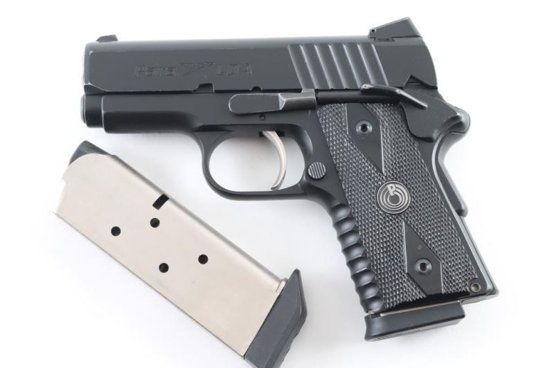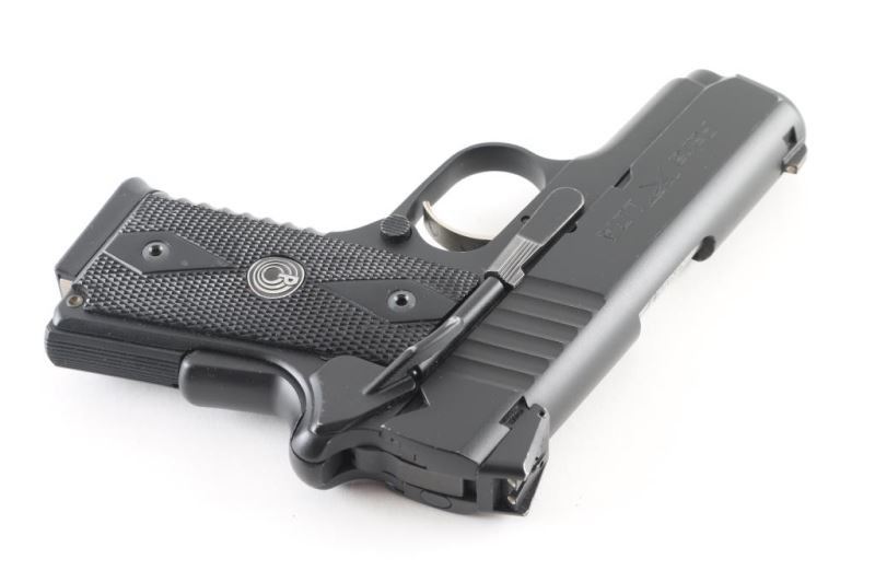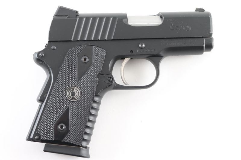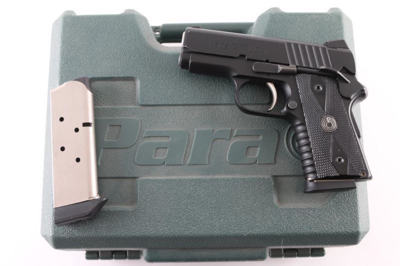 Canadian made semiautomatic pistol imported by Para USA Inc of Ft Lauderdale FL. Features slim frame with single stack magazines, matte black finish, black checkered grips with Para logo, 3" barrel, manual safety and grip safety. Operates using the Para-Ord LDA (light double action) trigger which provides a light and smooth trigger operation, no restrike capability. Bore is excellent. Retains 90% finish and shows very minor handling. Grips are good condition, appear to be painted wood. Includes factory plastic box, manual, (2) magazines. Condition: NRA Excellent